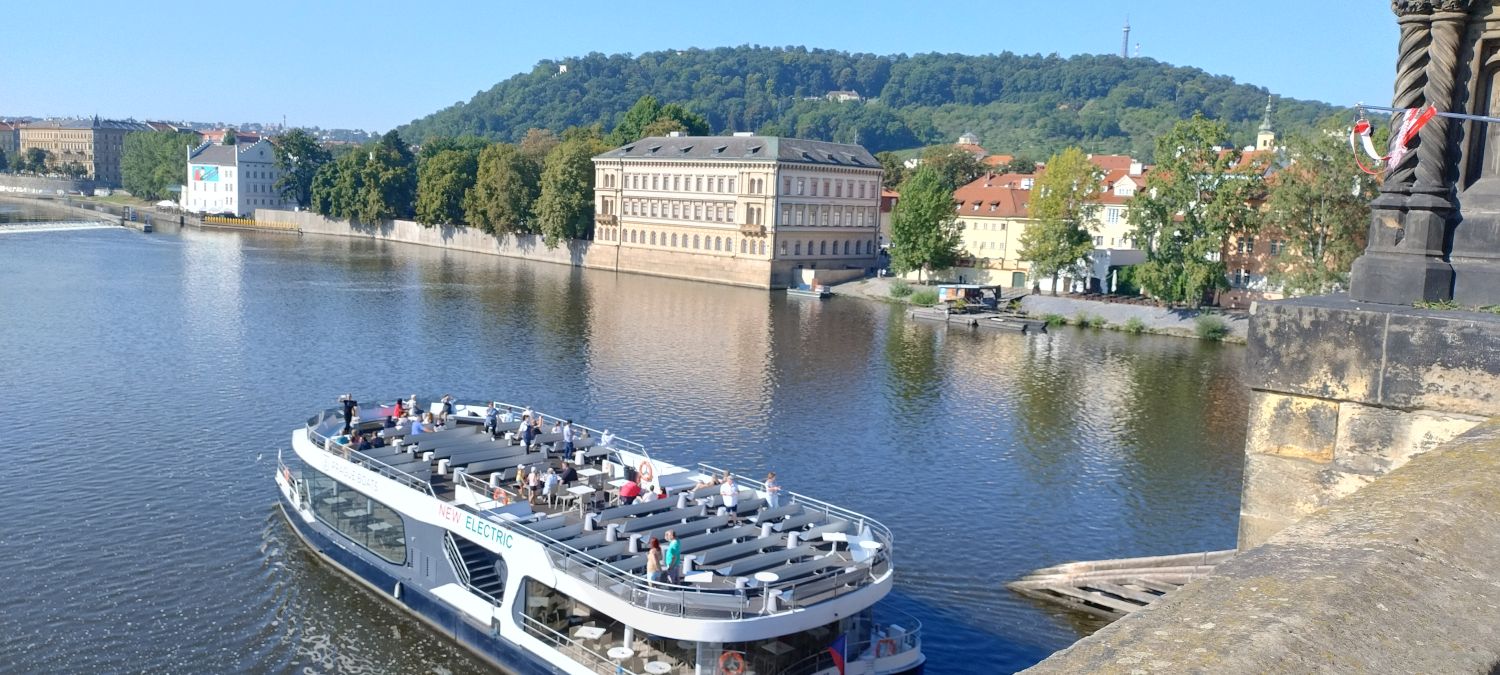 Zdjęcia rzeki Wełtawy zrobione z statku i nocą