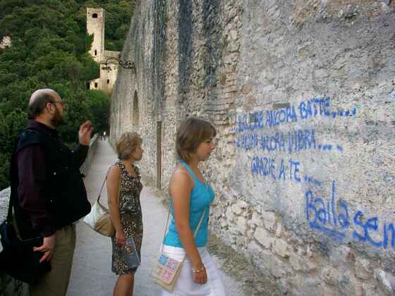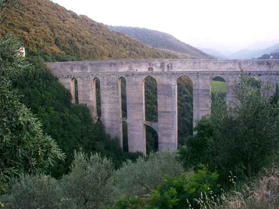 Spoletto - Przybyliśmy tu zwiedzić wiadukt wodny, który został zbudowany 2 tyś. lat temu. Zasilał on w wodę bijącą na jednej górze, zamek położony na drugiej górze, na zasadzie naczyń połączonych. Aquawiadukt ma 80 m wysokości i jest imponujący.