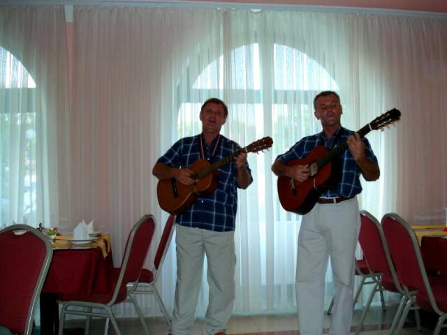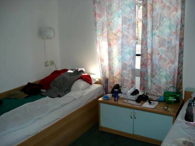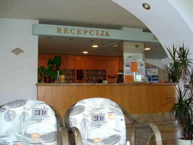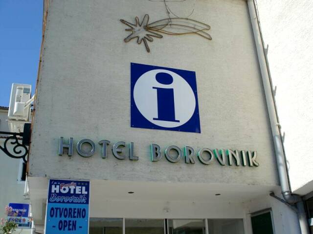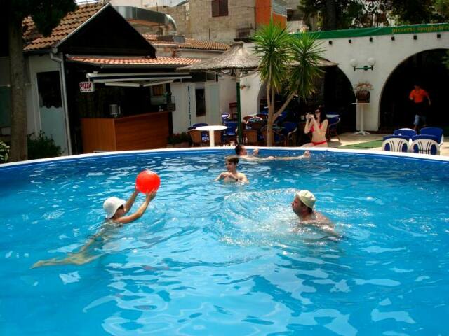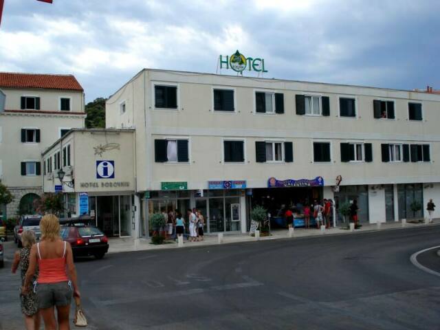 Zostaliśmy zakwaterowani w hotelu "Borovik" w mieście Tisno. Jest to jedyny hotel w okolicy. Właścicielem jest prywatna osoba od trzech pokoleń. Był to budynek (dwa budynki połączone między sobą) z dziedzińcem na którym stał basen w kształcie okręgu. Oczywiście bufet i pizzeria w którym można było sobie zamówić różne frykasy, począwszy od wody przez piwo, wino i wódki. Pokoje dwuosobowe mieliśmy przyzwoite. Telewizor, telefon, wentylator, łazienka z prysznicem i płatna lodówka były na wyposażeniu każdego pokoju. Brak klimatyzacji trochę doskwierał ale to właśnie po to ciepło tu przyjechaliśmy. Oczywiście hotel dysponował pokojami z klimatyzacją ale były droższe. Stołówka na dole składała się z dwóch sal. Szwedzki stół na śniadanie oferował prawie wszystko, sery, dżemy, płatki różnego typu, wędlina, owoce, pomidory, sałatki czego tam nie było? oczywiście kawa, herbata, soki. Obiadokolacje też były w formie szwedzkiego stołu. Zupa (jucha po chorwacku) była jedna ale drugie dania przeróżne - mięsa, ryby, sosy, makarony, nawet była specjalność zakładu - "Mussaka". Wyżywienie oceniam na pięć. Kilka razy na obiadokolacji była muzyka wykonywana na gitarach.