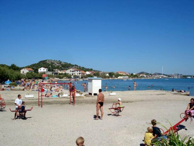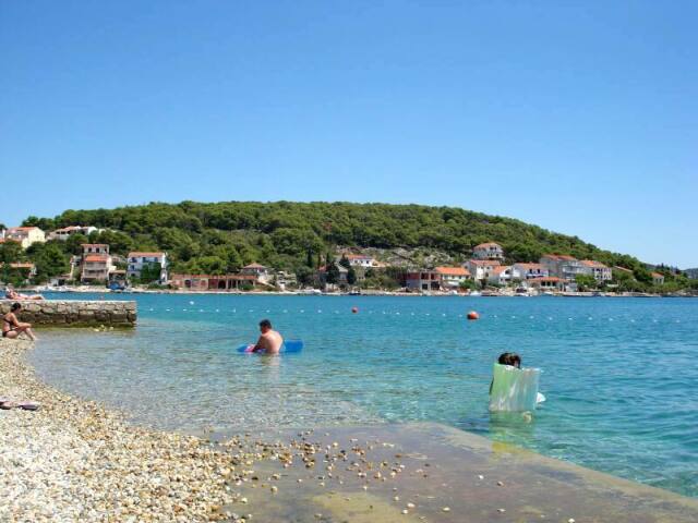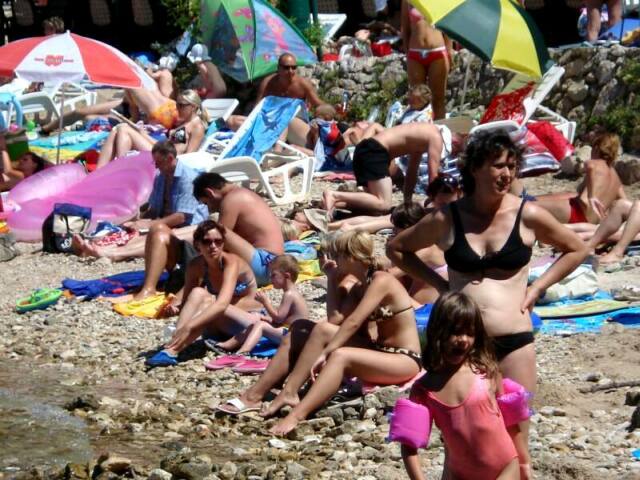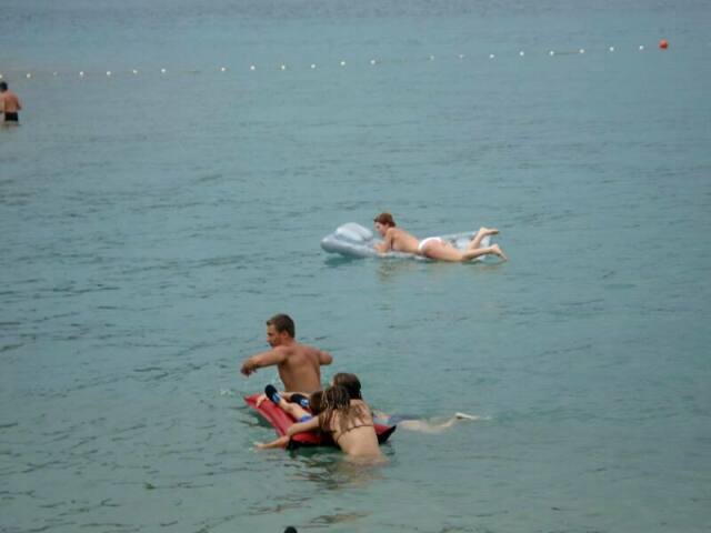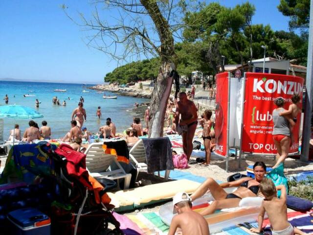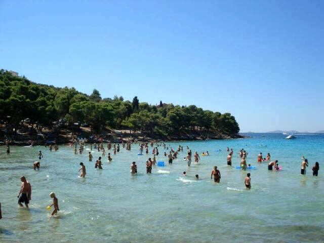 Plaże w Chorwacji są kamieniste, myślę że już każdy o ty wie. Około pół kilometra od hotelu mieliśmy plaże hotelową choć hotel był usytuowany przy samym morzu. Była ona czysta zadbana wysypana kamyczkiem po którym można było nawet chodzić bez obuwia. Niestety w morzu były jeżowce i wejście do wody bez obuwia było nie wskazane (myśmy nie wchodzili do wody tylko pływali a wiadomo że jeżowce są na dnie morza i nie stanowią zagrożenie dla tych co pływają). Były jeszcze inne plaże. Jedna była wysypana kamykiem okrągłym a jedna nie była wysypywana żadnym kamykiem (tam było najwięcej jeżowców), a była jeszcze dla lubiących się opalać w stroju Adama i Ewy, była na uboczu z dużymi skalnymi głazami co sprzyjało opalaniu się na golasa.
