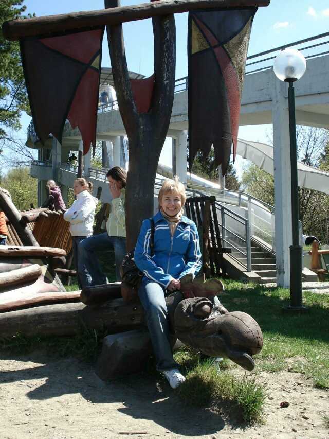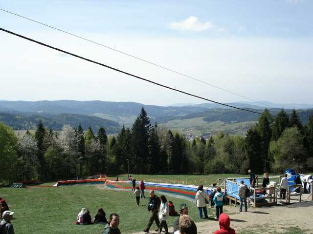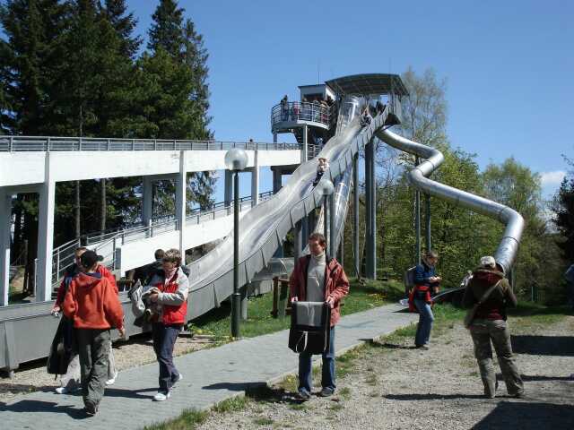 Dla mnie największą atrakcją była podróż na Górę Parkową. Jechaliśmy tam kolejką szynową wyciąganą na górę za pomocą liny w takim skośnym wagoniku. Na górze atrakcją są zjazdy w rynnie i rurze siedząc w takim wielkim filcowym bucie. Są tam też zjazdy po igielicie siedząc na dmuchanym okrągłym pontonie.