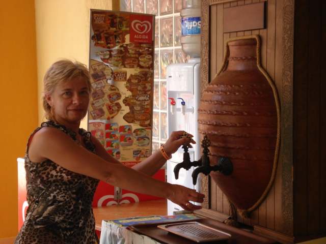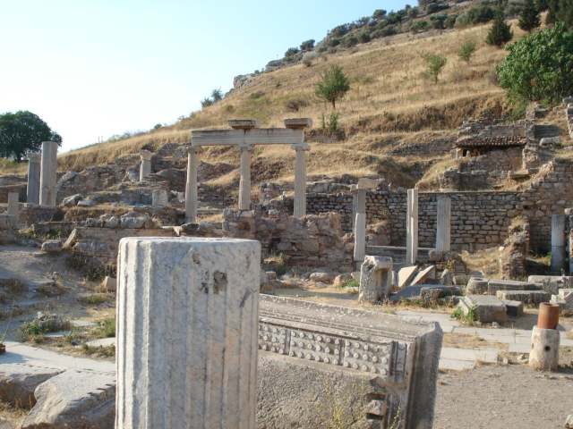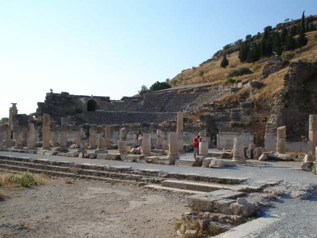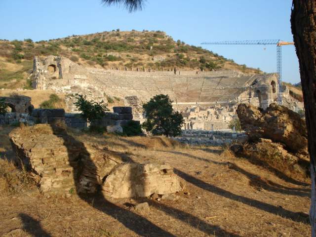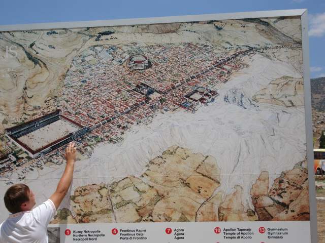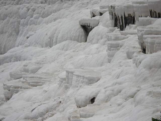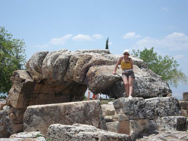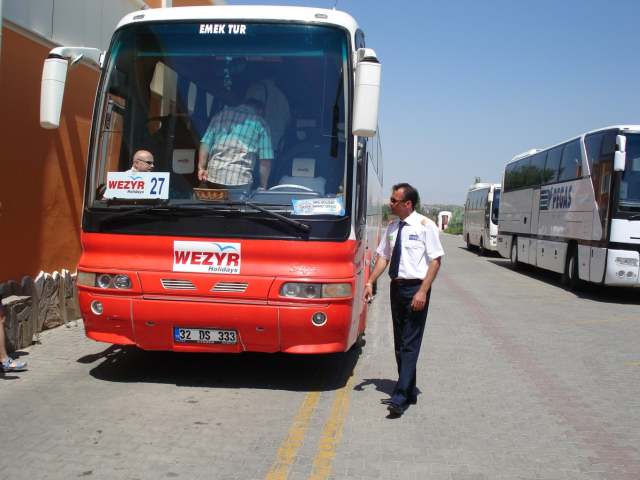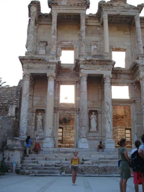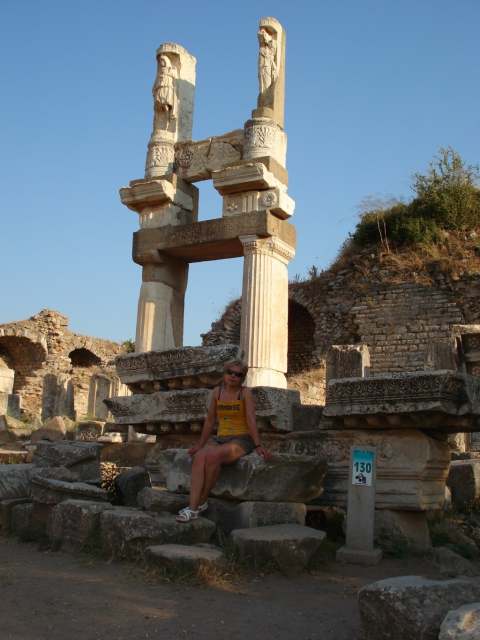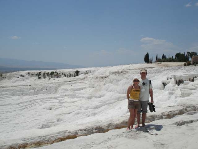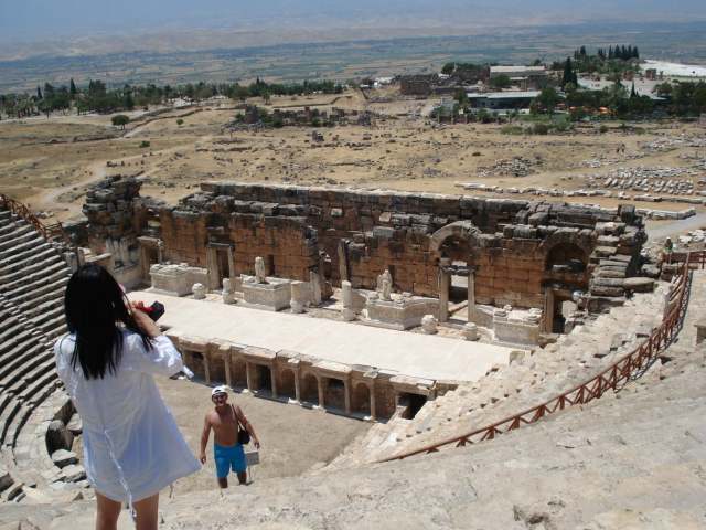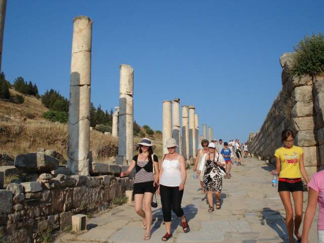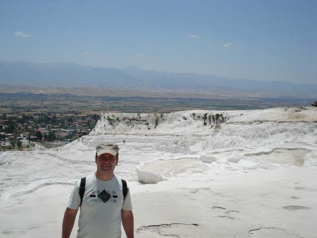 Drugiego dnia po śniadaniu zostaliśmy zapakowani do autobusu "Wezyr 27" i rozpoczęła się nasza przygoda w Turcji polegająca na zwiedzaniu całej zachodniej jej części. Pierwszym przystnkiem było Pamukale z ruinami rzymskiego miasta Hierapolis, które w czasie swej świetności było czymś w rodzaju dzisiejszego SPA. W Pamukaje wody wypływające a zawierające duże ilości wapnia utworzyły przepiękne kaskadowe nacieki, białe jak śnig a zwane też Bawełnianym pałacem. Kiedyś na tych bawełnianych naciekach były baseny do kąpieli, dzięki staraniom władz, kąpiele zostały zakazane, istnieje tylko basen Kleopatry w którym można zanużyć się w wodzie wypływającej z pod ziemi. Legenda mówi kto zanuży się w wodzie w basenie Kleopatry zostanie odmłodzony o 10 lat. Nam oczywiście się to sprawdziło. Następnym przystankiem był Efes, ruiny miasta które swą świetność niało w 4 wieku pne. Było to miasto portowe lecz częśienia ziemi i zamulenie się portu sprawiły upadej miasta. W tym mieście św. Jan przebywał wraz z Maryją i tam napisał Ewangelię. Po zwiedzeniu Efesu pojechaliśmy do miasta Kuszadasi i zostaliśmy zakwaterowani w hotelu.