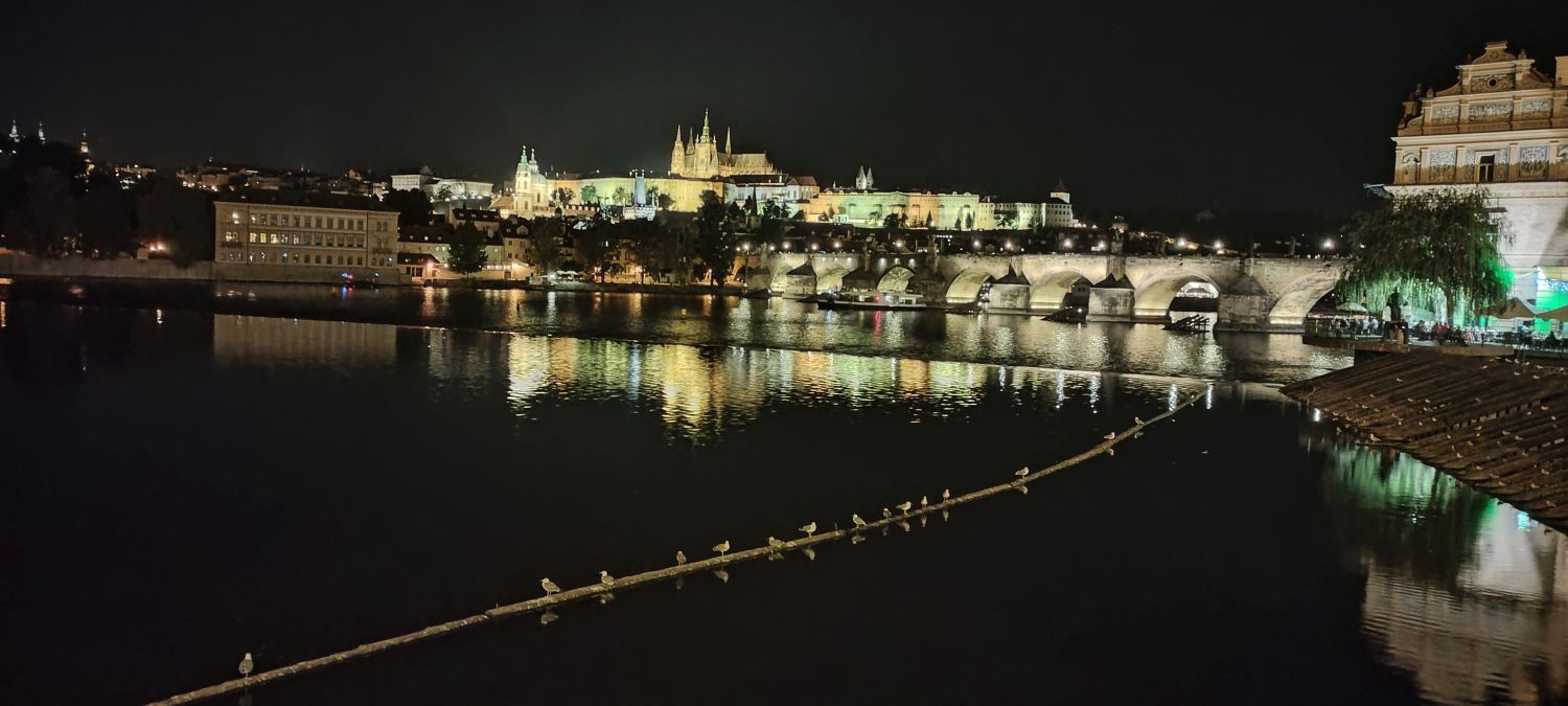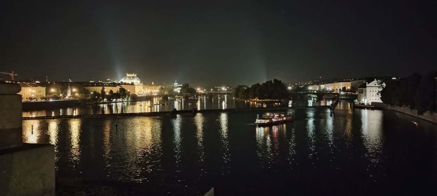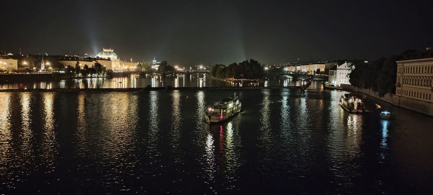 Zdjęcia rzeki Wełtawy zrobione z statku i nocą