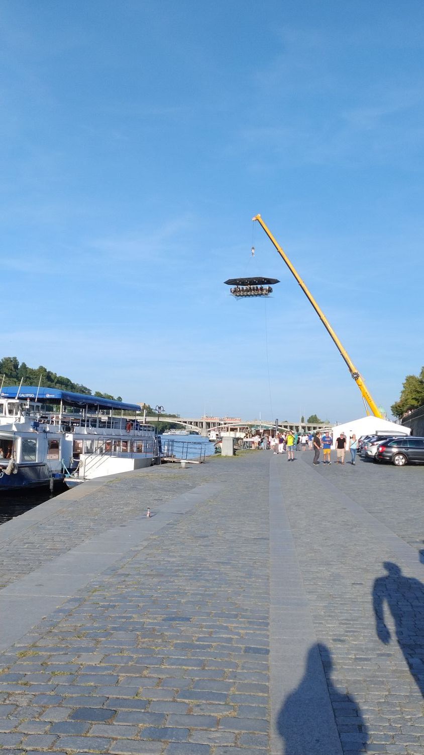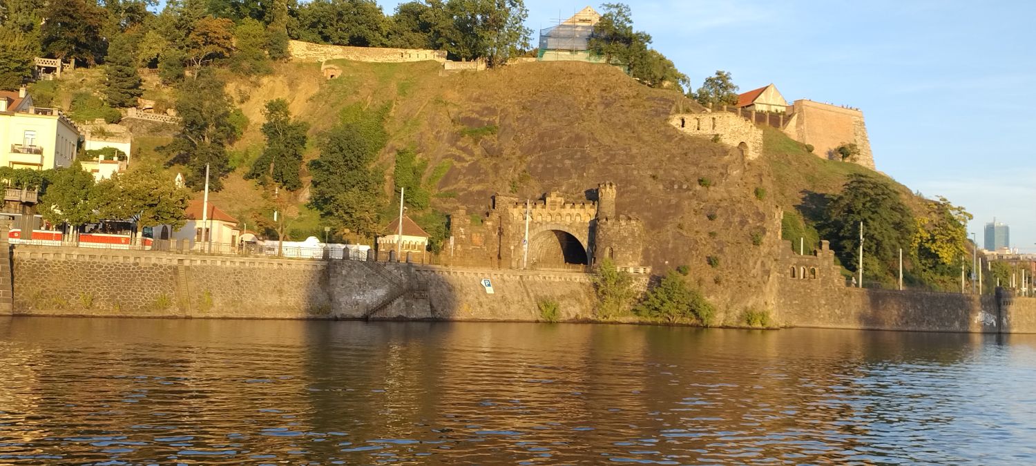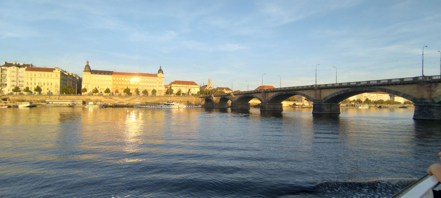 Zdjęcia rzeki Wełtawy zrobione z statku i nocą