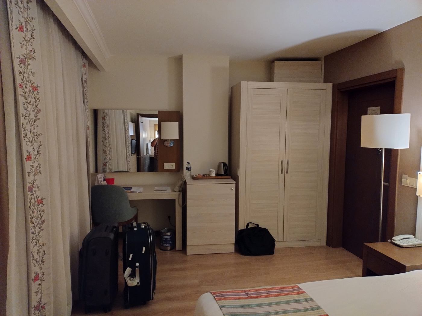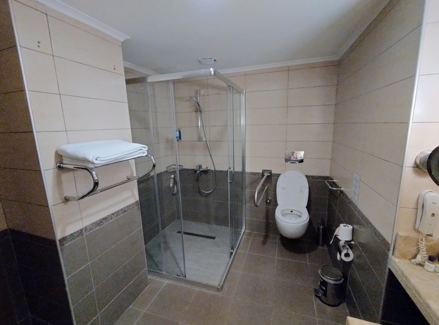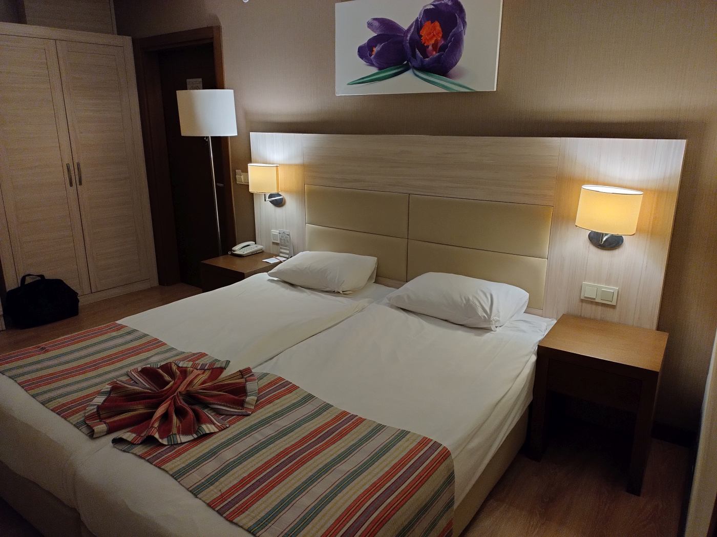 Pokój dostaliśmy na 1 piętrze z numerem 1202, oczywiście był z balkonem nie na może i niestety pod oknami była ruchliwa droga ale pokój nie jest do siedzenia tylko do spania a w nocy ruch był mały. Ładne duże łóżko, szafa, lodówka, biurko, duża łazienka z prysznicem. Ogólnie nie najnowszy pokój ale może być