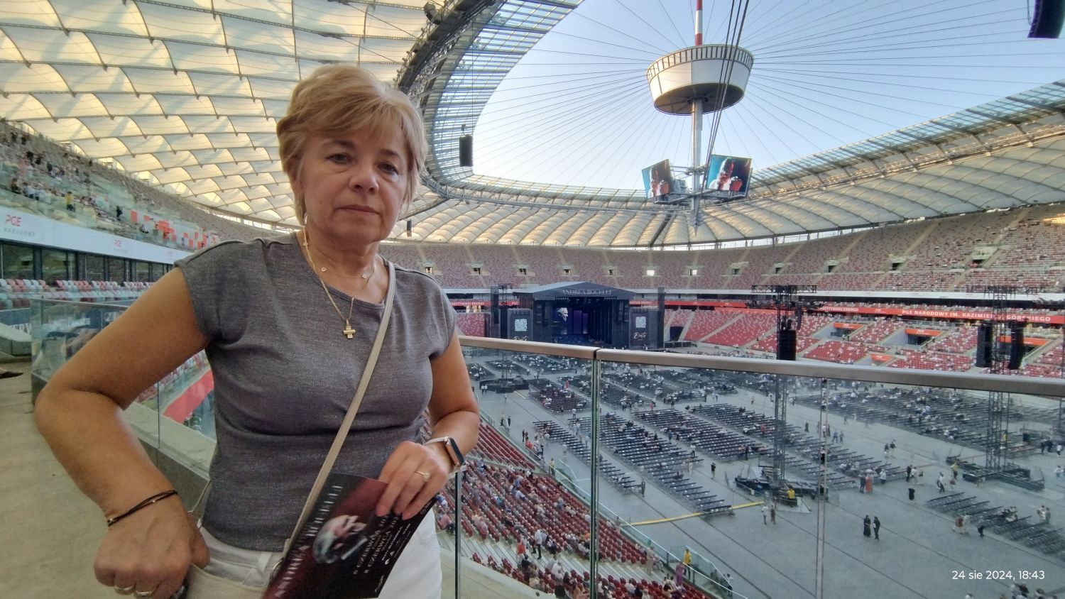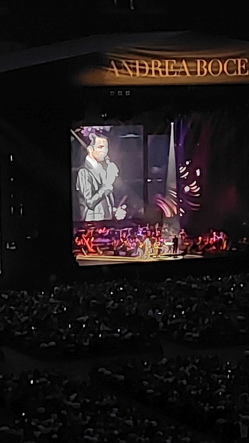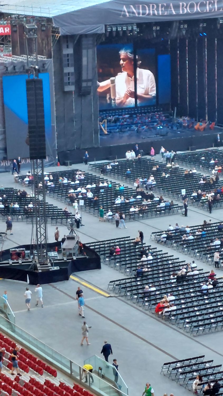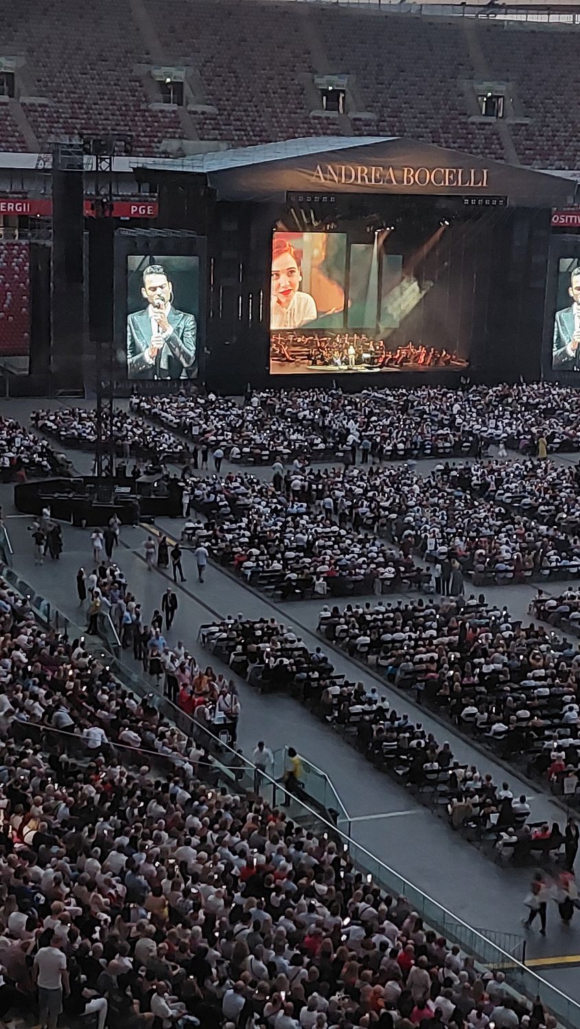 Tramwajem udaliśmy się na PGE Narodowy a o 19:00 zajęliśmy nasze miejsca, sektor G33. Koncert rozpoczął się o 20:00 Matteo Bocelli zaśpiewał sześć piosenek, ostatnią „Falling Back” wraz z naszą Sanah. Potem na scenę wszedł Andrea Bocelli, który w tym roku obchodzi 30-lecie swojej pracy. Koncert składał się z dwóch części z 15 min. przerwą. Andrea zaśpiewał m.in. "O soave fanciula", "Mamma", "Vivo per lei", "Canto della terra", "Granada", "Titanium". Podczas koncertu Andrei Bocellego wystąpiła jeszcze rumuńska śpiewaczka Cristinę Pasaroiu, włoska skrzypaczka Rusandę Panfili wykonując Czardasza.