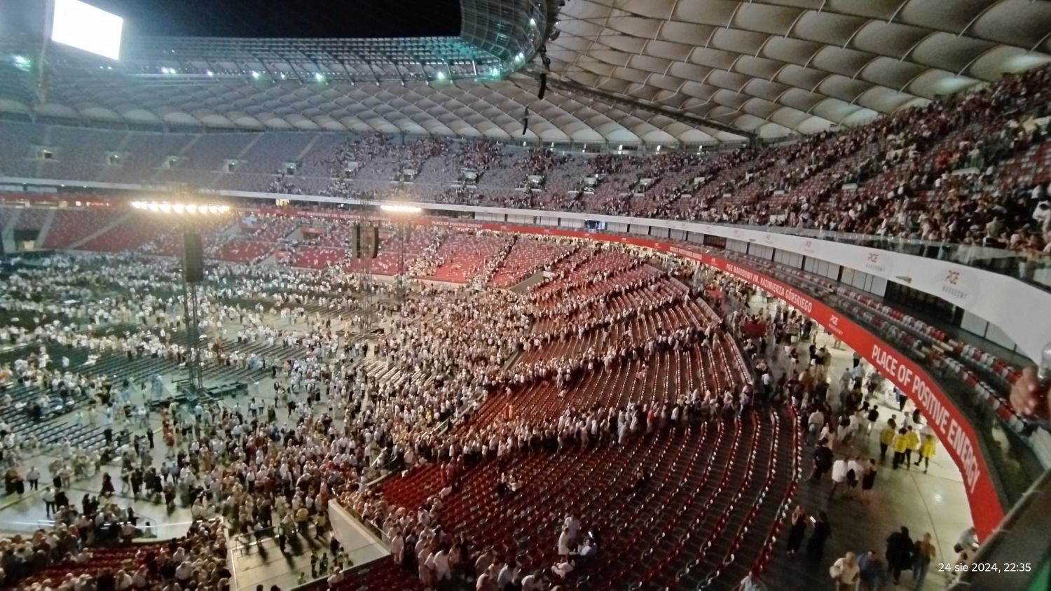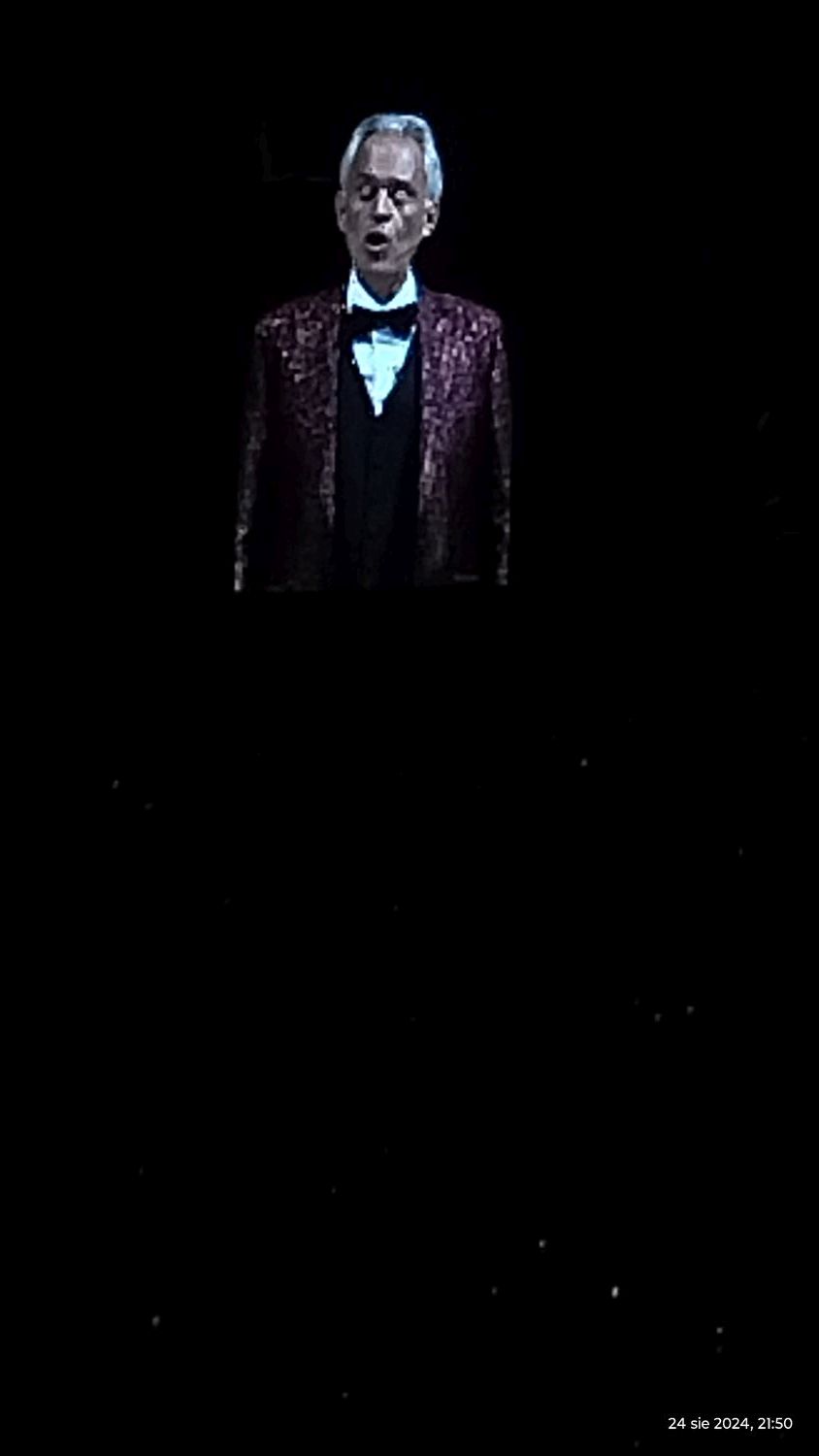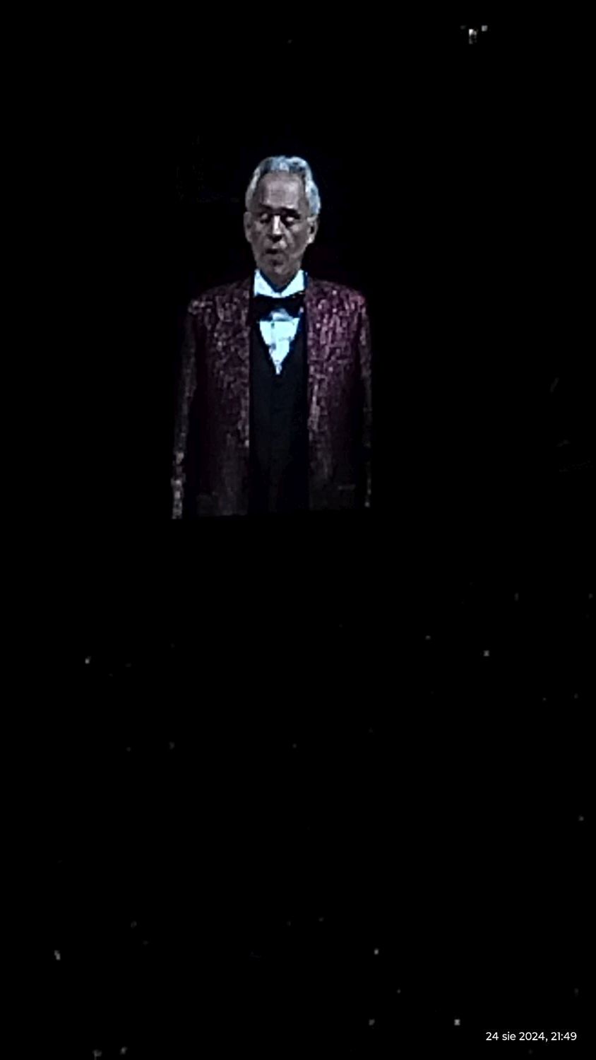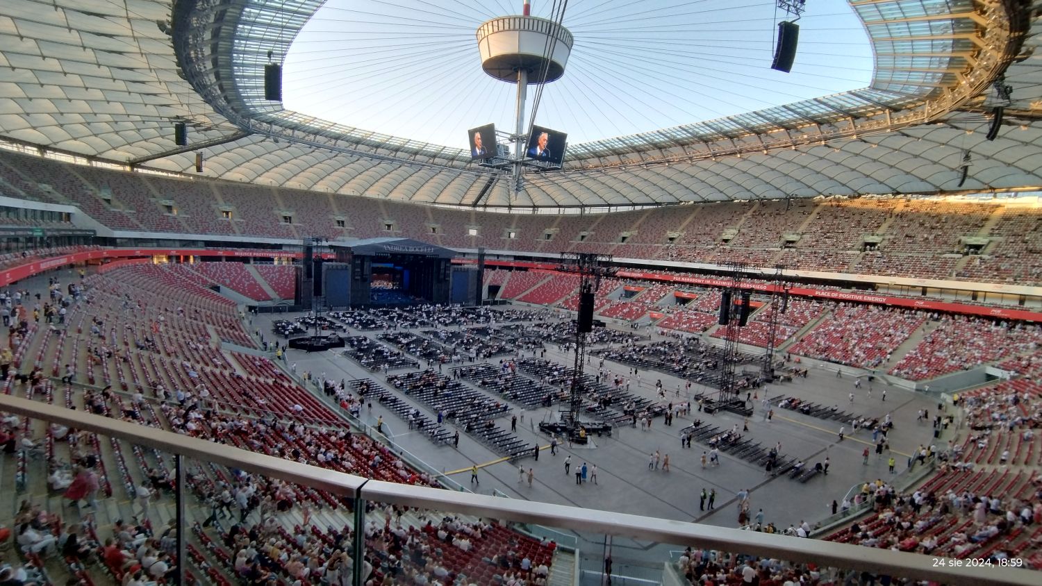 Tramwajem udaliśmy się na PGE Narodowy a o 19:00 zajęliśmy nasze miejsca, sektor G33. Koncert rozpoczął się o 20:00 Matteo Bocelli zaśpiewał sześć piosenek, ostatnią „Falling Back” wraz z naszą Sanah. Potem na scenę wszedł Andrea Bocelli, który w tym roku obchodzi 30-lecie swojej pracy. Koncert składał się z dwóch części z 15 min. przerwą. Andrea zaśpiewał m.in. "O soave fanciula", "Mamma", "Vivo per lei", "Canto della terra", "Granada", "Titanium". Podczas koncertu Andrei Bocellego wystąpiła jeszcze rumuńska śpiewaczka Cristinę Pasaroiu, włoska skrzypaczka Rusandę Panfili wykonując Czardasza.