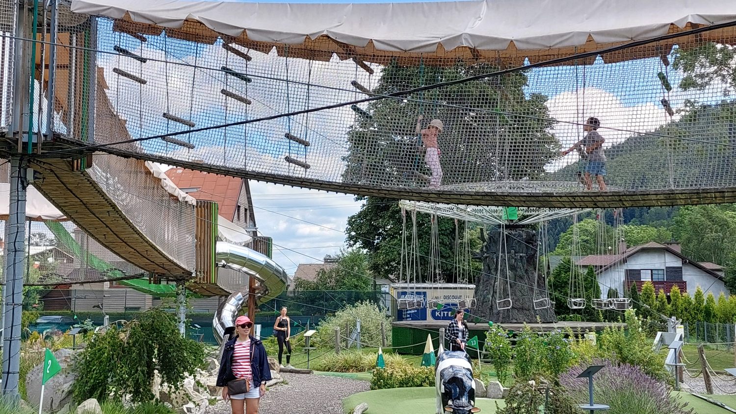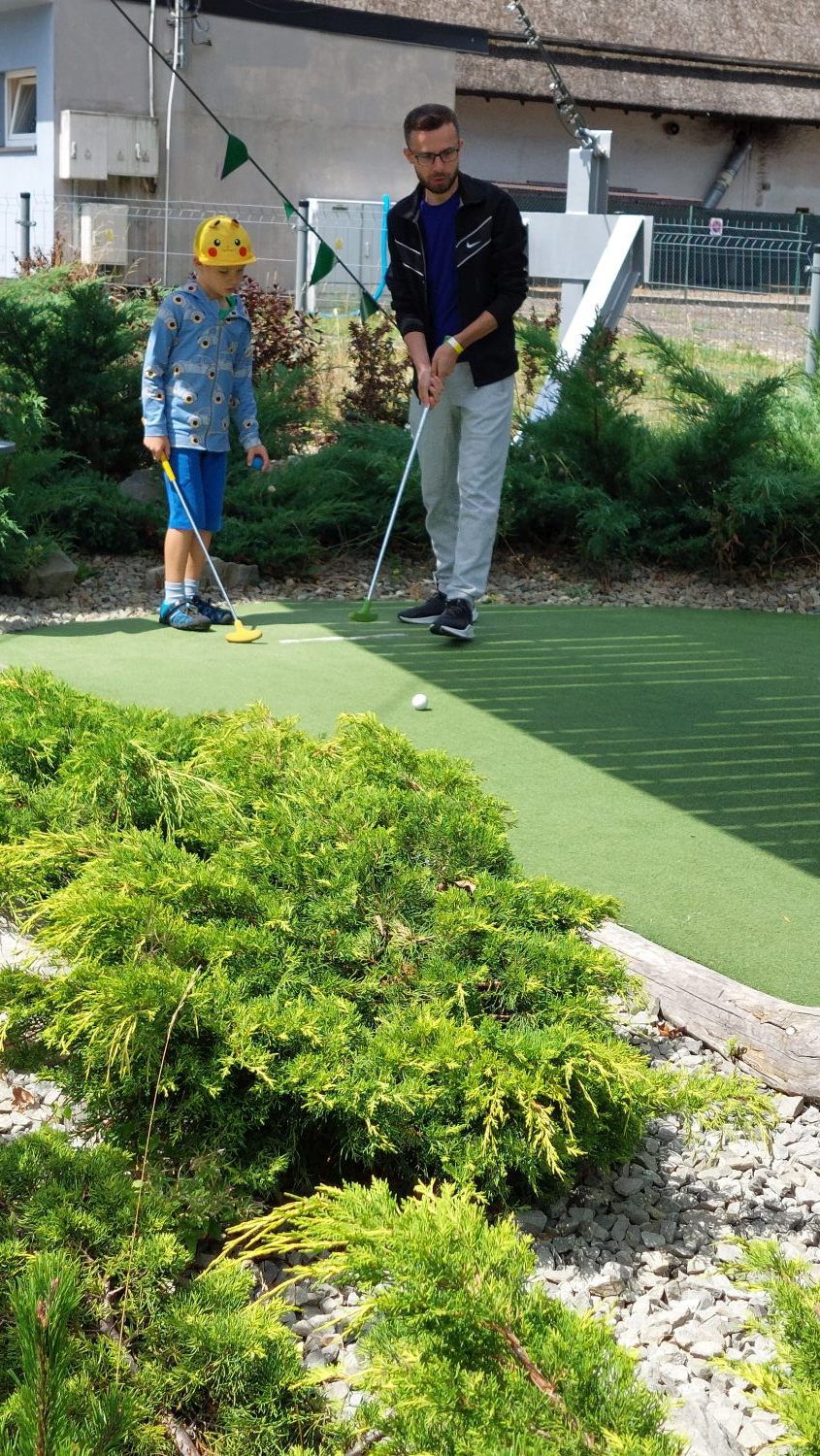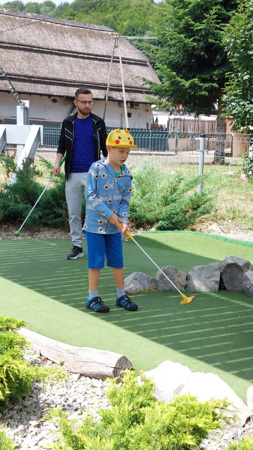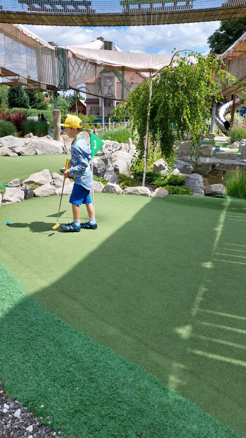 Plac zabaw i mini golf Jedną z atrakcji dla moich wnuków był plac zabaw, z przejściem linowym a raczej kładkowym na wysokości z różnymi przeszkodami. Filip zachwycił się mini golfem, od 15:00 do 19:00 gra zajęła mu czas.