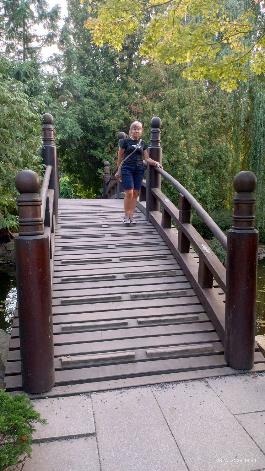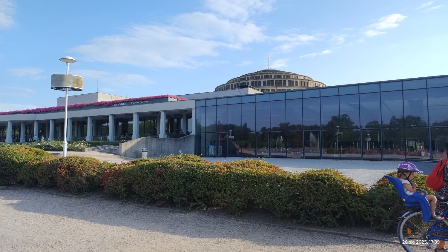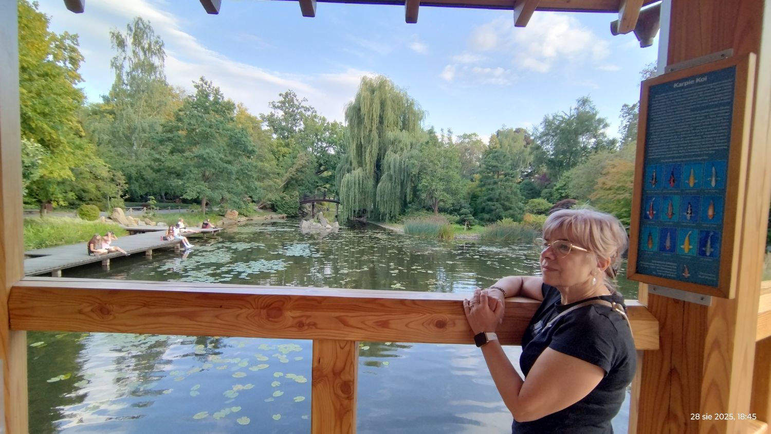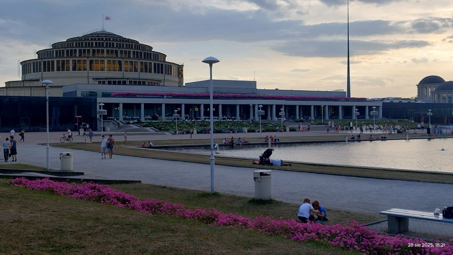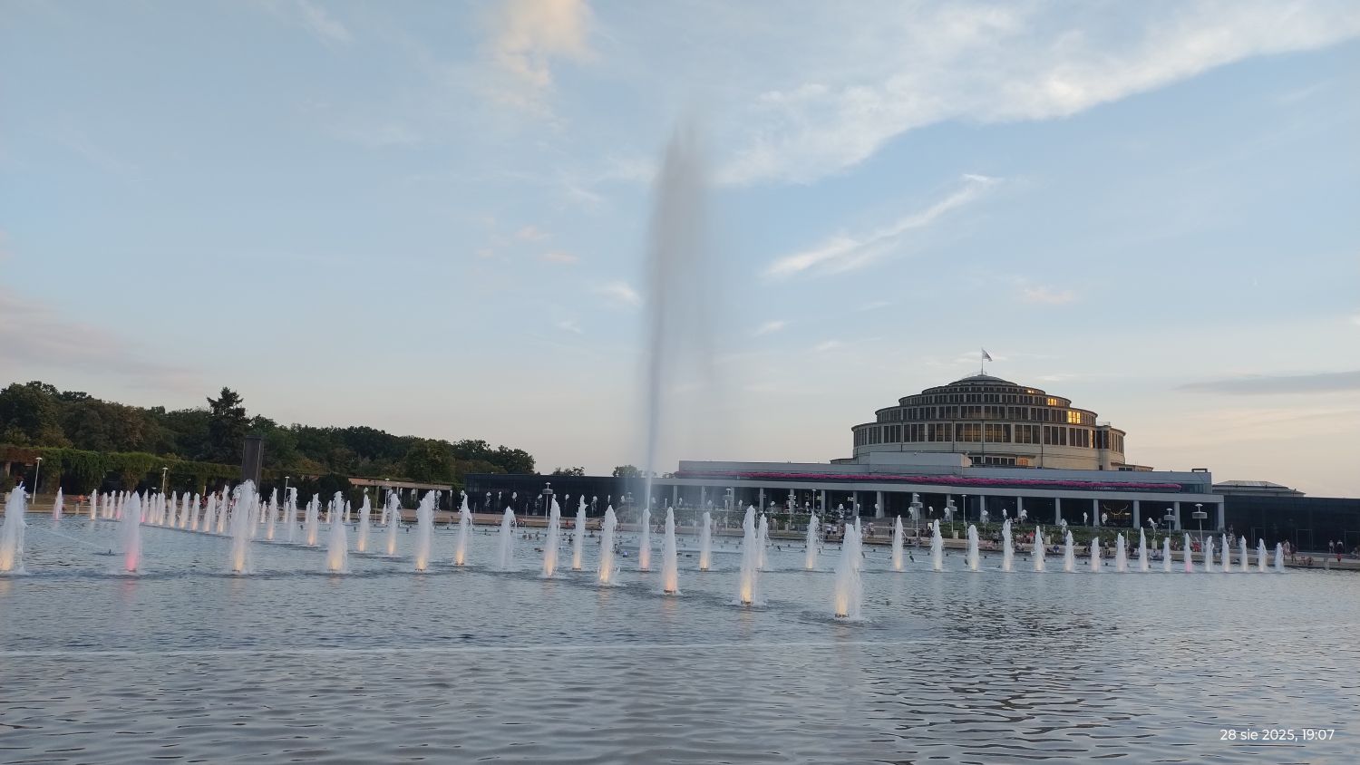 Hala Stulecia do której się wybraliśmy Uberem bo nie bardzo wiedzieliśmy jakim tramwajem a i gdzie przystanek też nie wiedzieliśmy. Koło hali piękna tańcząca fontanna z podświetlanymi słupami wody a dalej betonowa pergola obrośnięta pnączami. Za nią Ogród Japoński, pospacerowaliśmy trochę i oglądnęliśmy olbrzymie ryby w stawie.