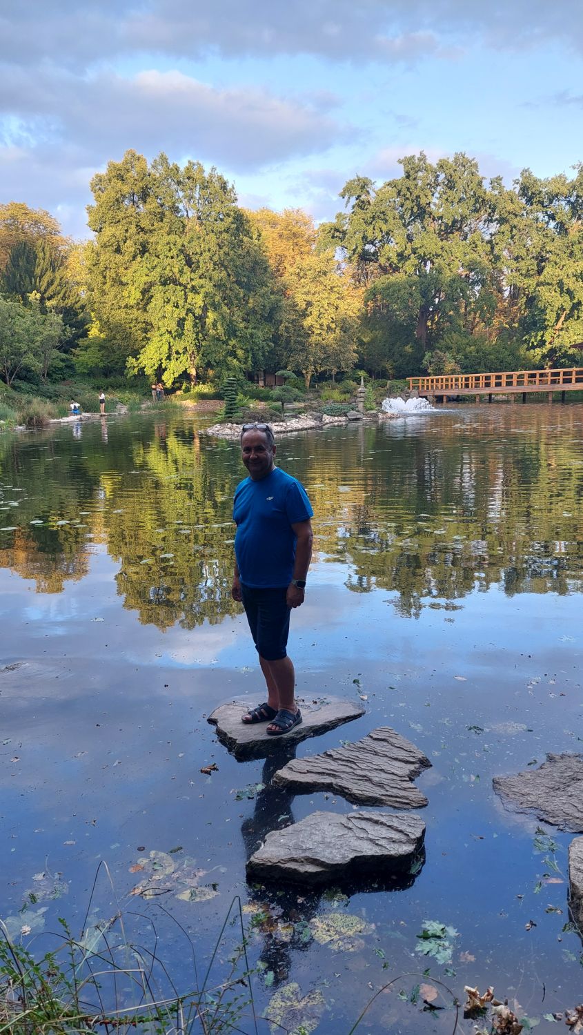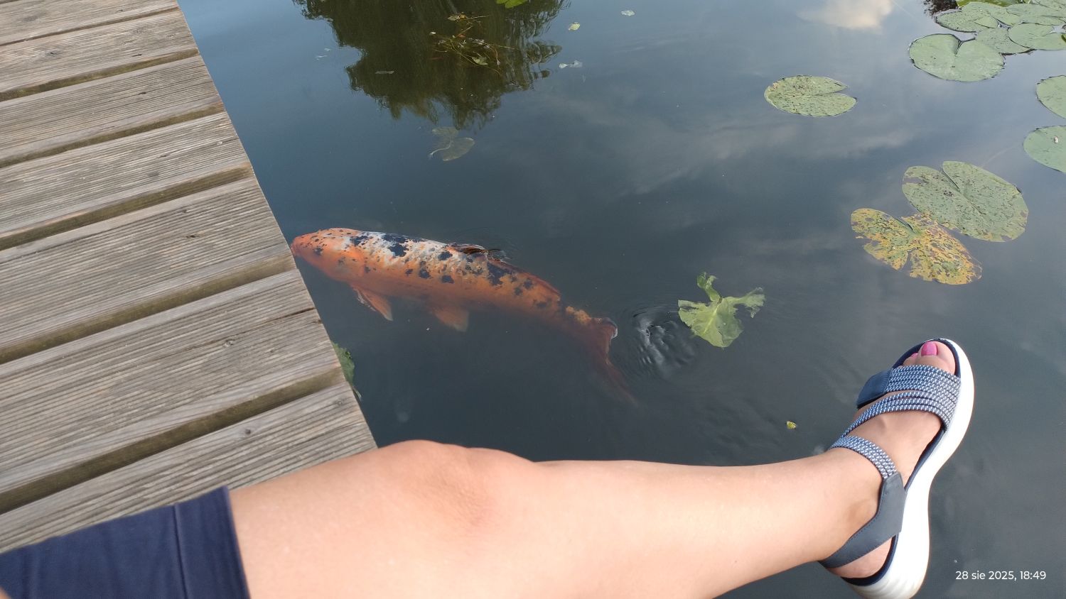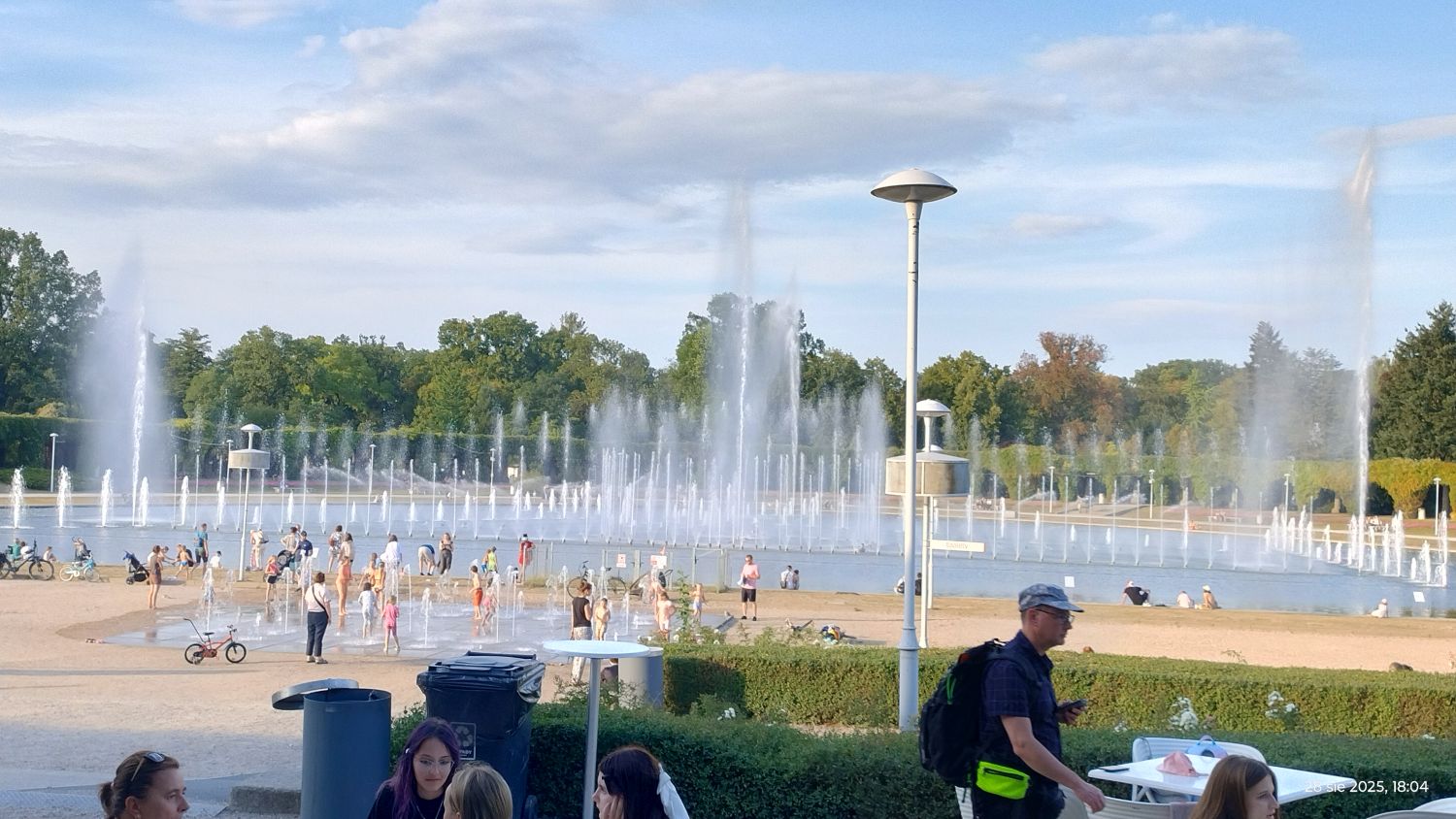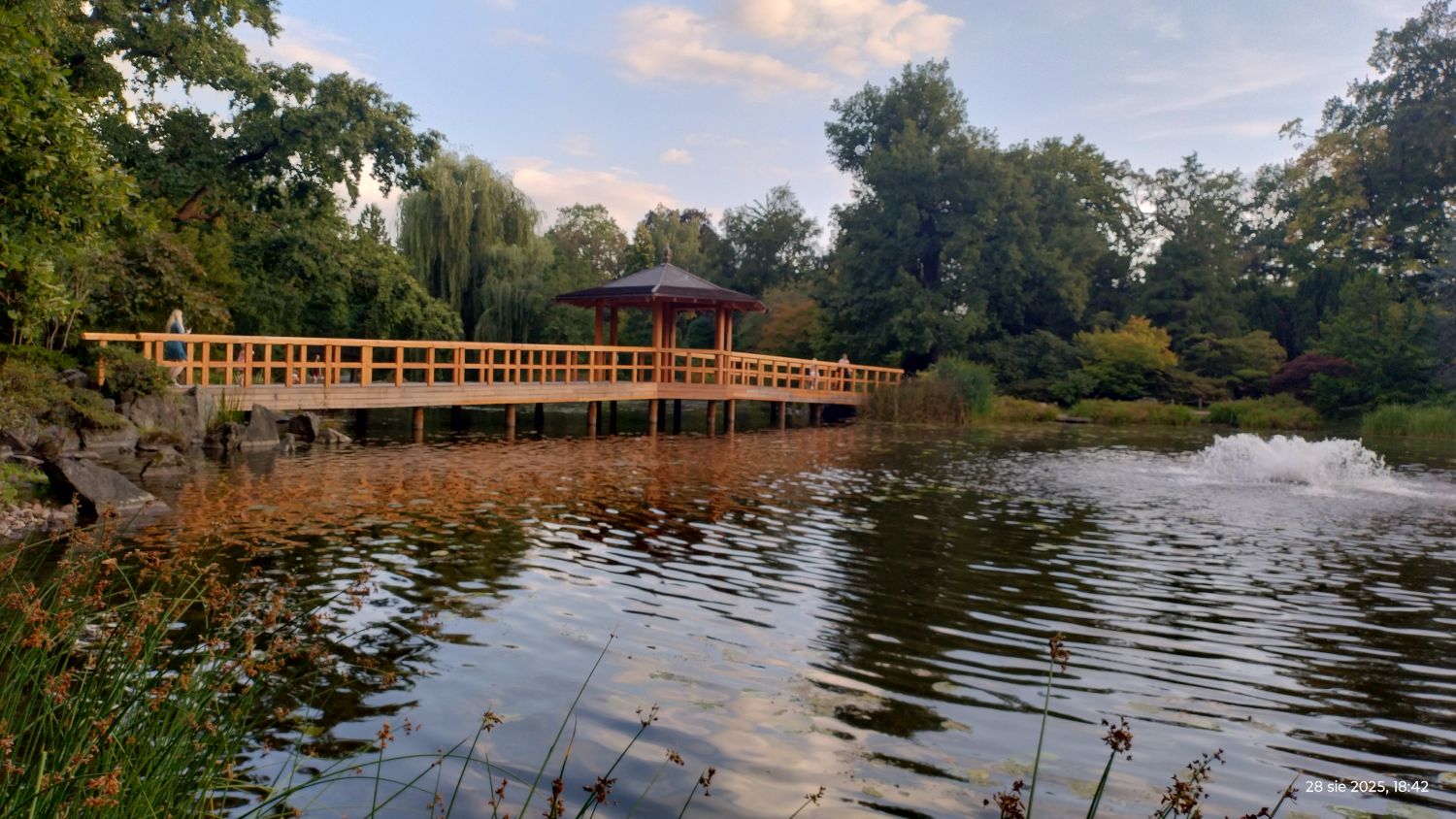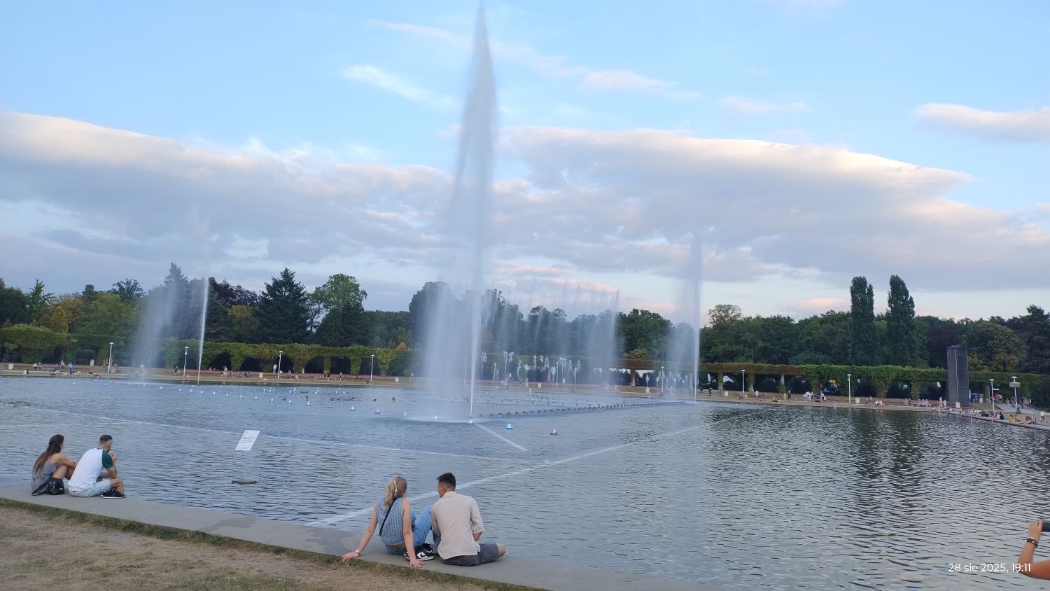 Hala Stulecia do której się wybraliśmy Uberem bo nie bardzo wiedzieliśmy jakim tramwajem a i gdzie przystanek też nie wiedzieliśmy. Koło hali piękna tańcząca fontanna z podświetlanymi słupami wody a dalej betonowa pergola obrośnięta pnączami. Za nią Ogród Japoński, pospacerowaliśmy trochę i oglądnęliśmy olbrzymie ryby w stawie.