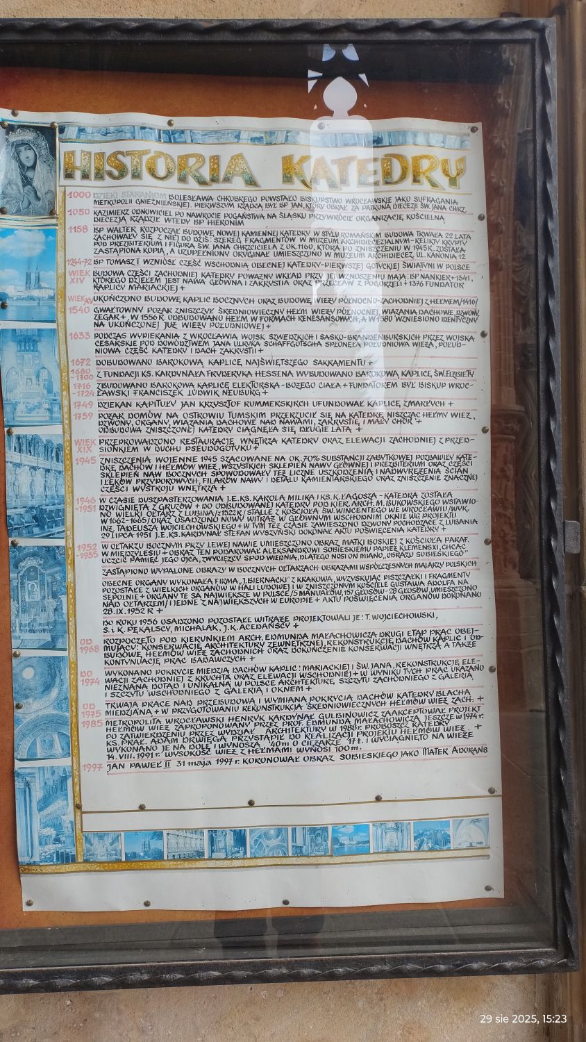 Zwiedziliśmy parę kościołów, Kościół pw. Św Elżbiety (garnizonowy) gdzie słuchaliśmy koncertu organowego. Katedra Św. Magdaleny gdzie byliśmy na Mszy Św. w niedzielę. Katedra Św. Jana Chrzciciela na Ostrowie Tumskim. Sporo tych kościołów we Wrocławiu, byliśmy tylko w niektórych.