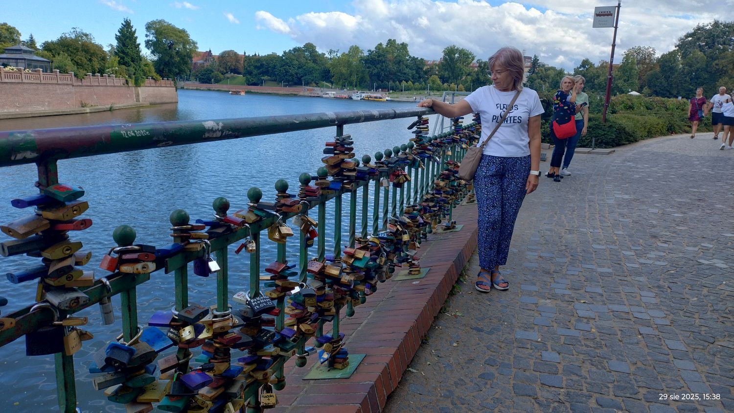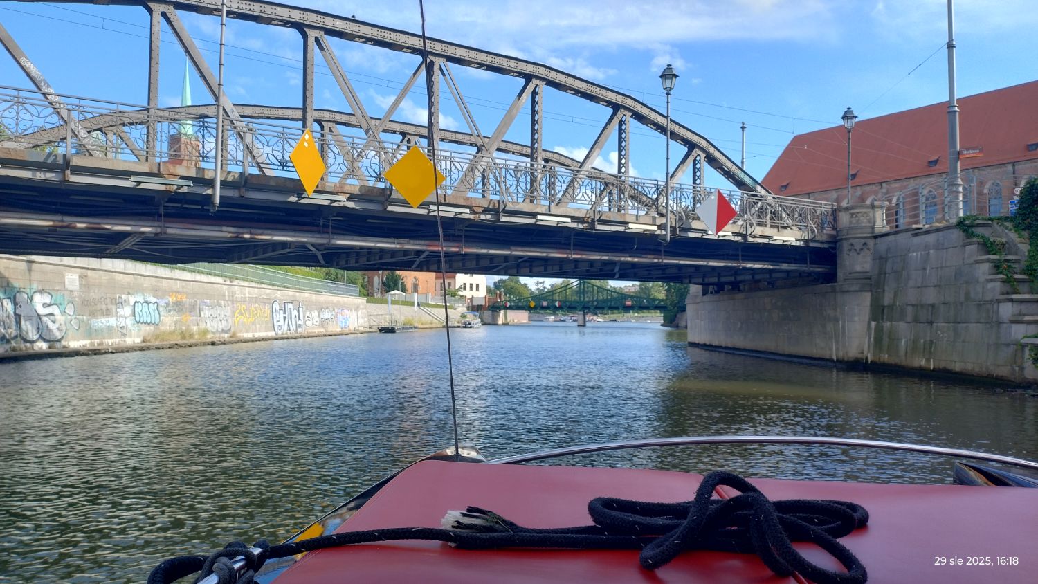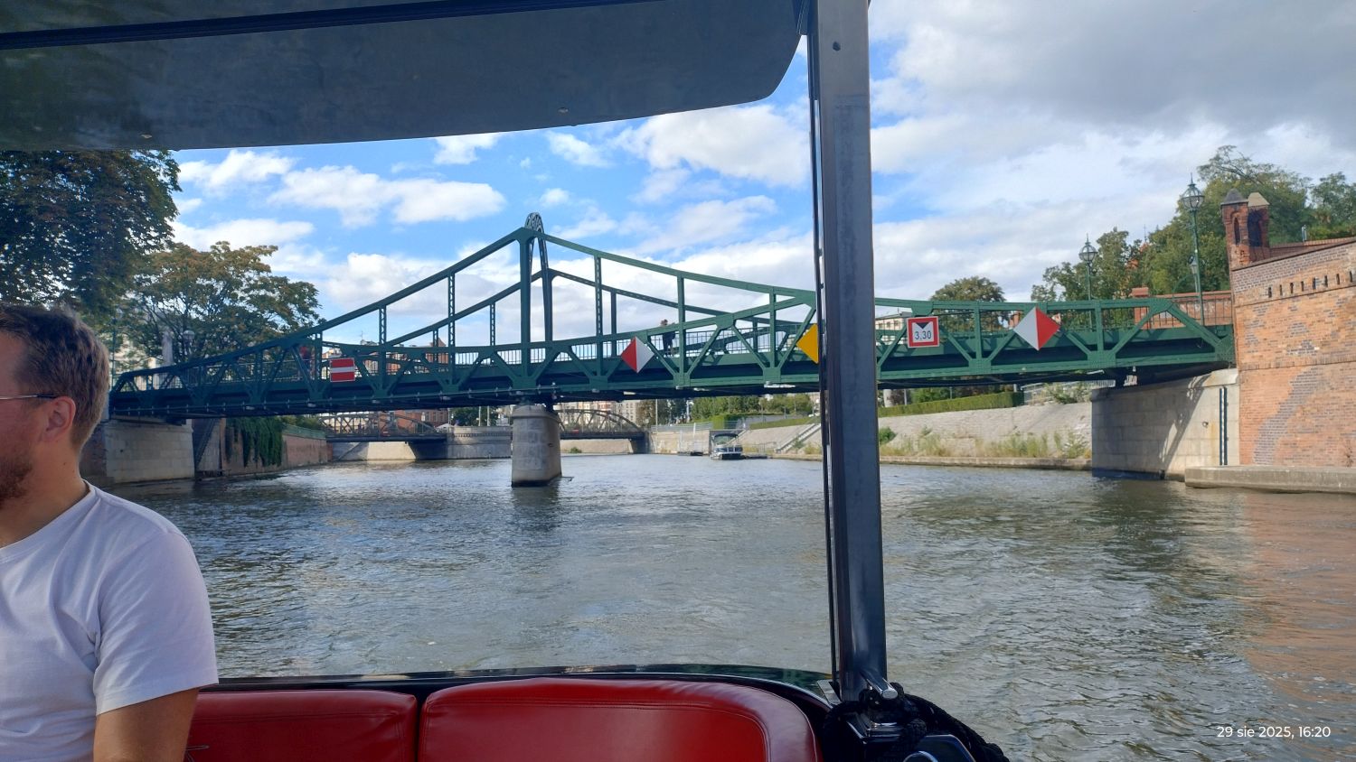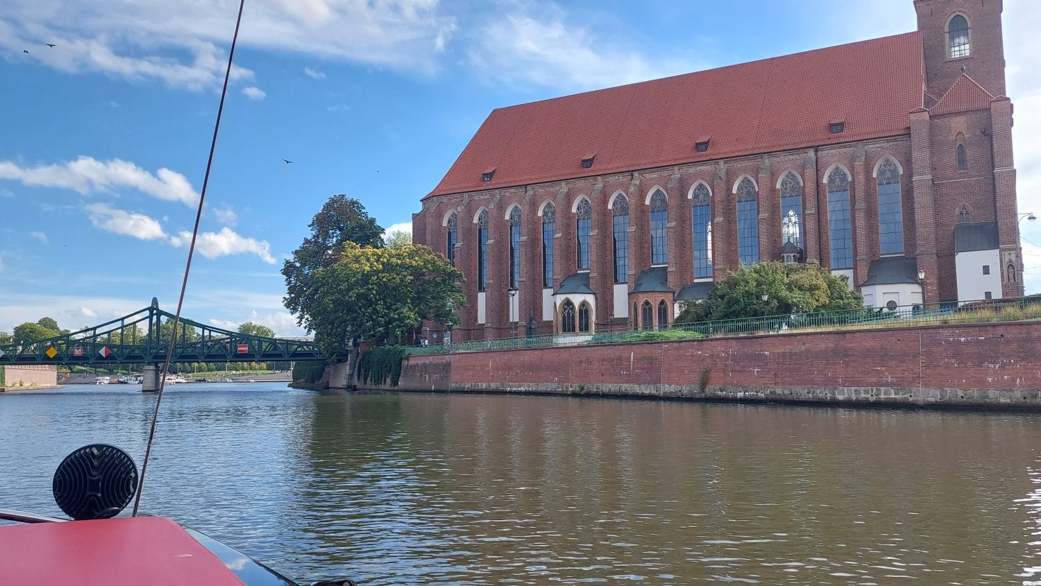 Wrocław jest nazywany miastem 100 mostów i sporo ich tu jest. Wybraliśmy się na rejs po Odrze. Przechodząc przez Ostrów Tumski i przez Most Tumski zwany też miłości, bo na nim młodzi małżonkowie zakładali kłódki i wrzucali klucz do rzeki z nadzieją, że ich związek przetrwa do starości (my nigdzie nie zakładaliśmy kłódki, a już obchodziliśmy 40 rocznicę ślubu), a kłódki miasto zdjęło i przetopiło na metal a było ich 42 tyś. teraz kłódki zakładają na nabrzeżu, na Wyspie Piasek wynajęliśmy katamaran elektryczny. Nim to opłynęliśmy wyspy Piasek, Daliową, Tamkę, Słodową, Młyńską i pod Mostem Młyńskim (jest ich dwa) popłynęliśmy w stronę Mostu Grunwaldzkiego za którym zawróciliśmy i powróciliśmy do Wyspy Piasek gdzie rozpoczynaliśmy rejs. Całość trwało około 50 min.