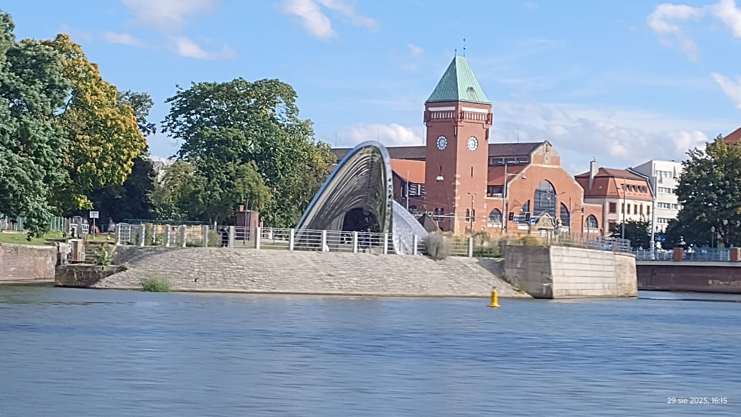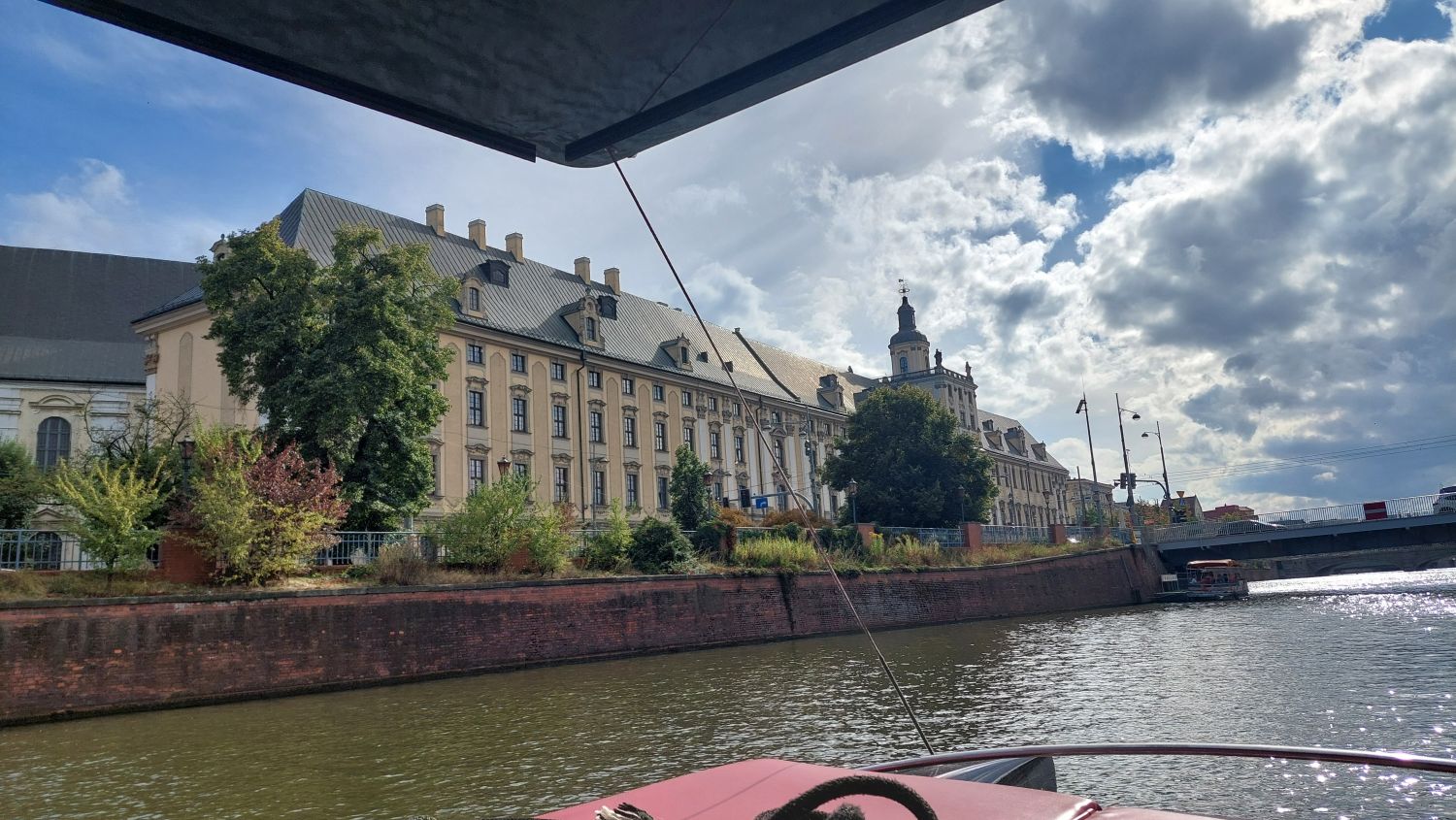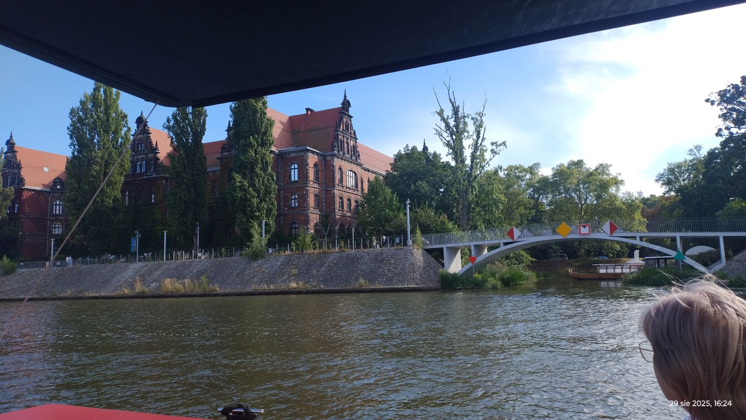 Wrocław jest nazywany miastem 100 mostów i sporo ich tu jest. Wybraliśmy się na rejs po Odrze. Przechodząc przez Ostrów Tumski i przez Most Tumski zwany też miłości, bo na nim młodzi małżonkowie zakładali kłódki i wrzucali klucz do rzeki z nadzieją, że ich związek przetrwa do starości (my nigdzie nie zakładaliśmy kłódki, a już obchodziliśmy 40 rocznicę ślubu), a kłódki miasto zdjęło i przetopiło na metal a było ich 42 tyś. teraz kłódki zakładają na nabrzeżu, na Wyspie Piasek wynajęliśmy katamaran elektryczny. Nim to opłynęliśmy wyspy Piasek, Daliową, Tamkę, Słodową, Młyńską i pod Mostem Młyńskim (jest ich dwa) popłynęliśmy w stronę Mostu Grunwaldzkiego za którym zawróciliśmy i powróciliśmy do Wyspy Piasek gdzie rozpoczynaliśmy rejs. Całość trwało około 50 min.