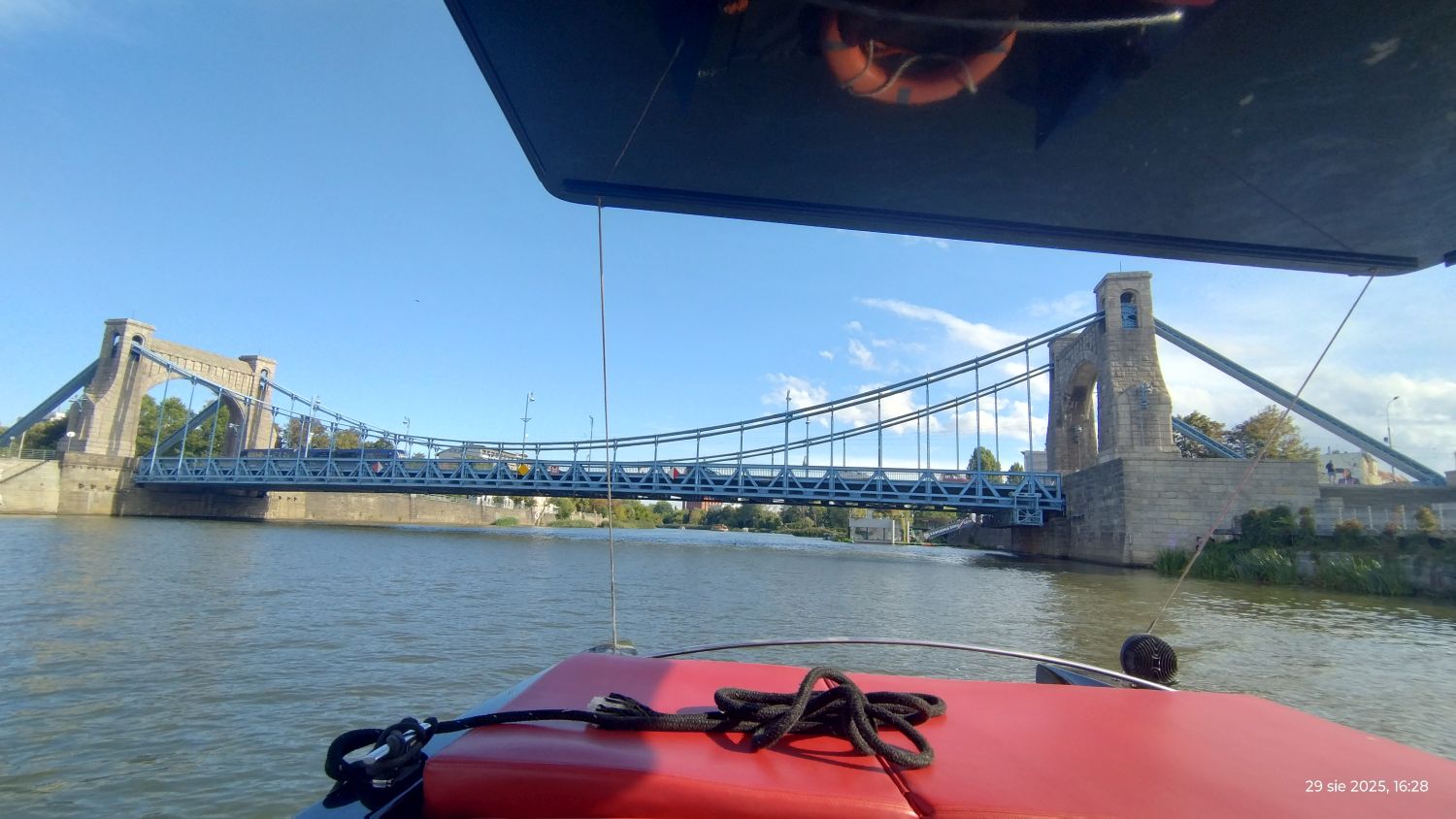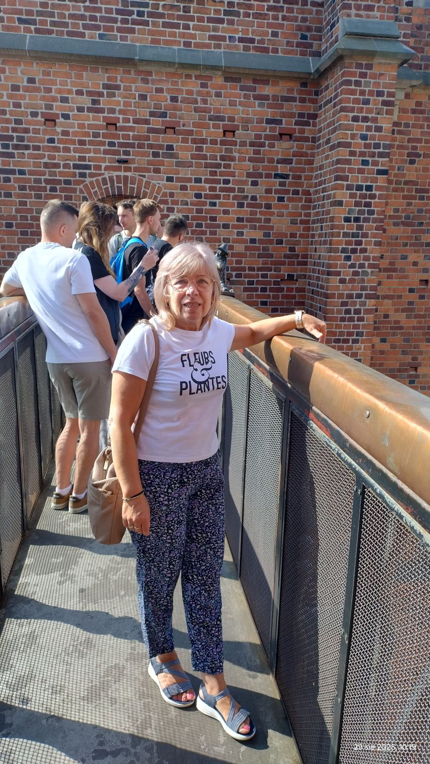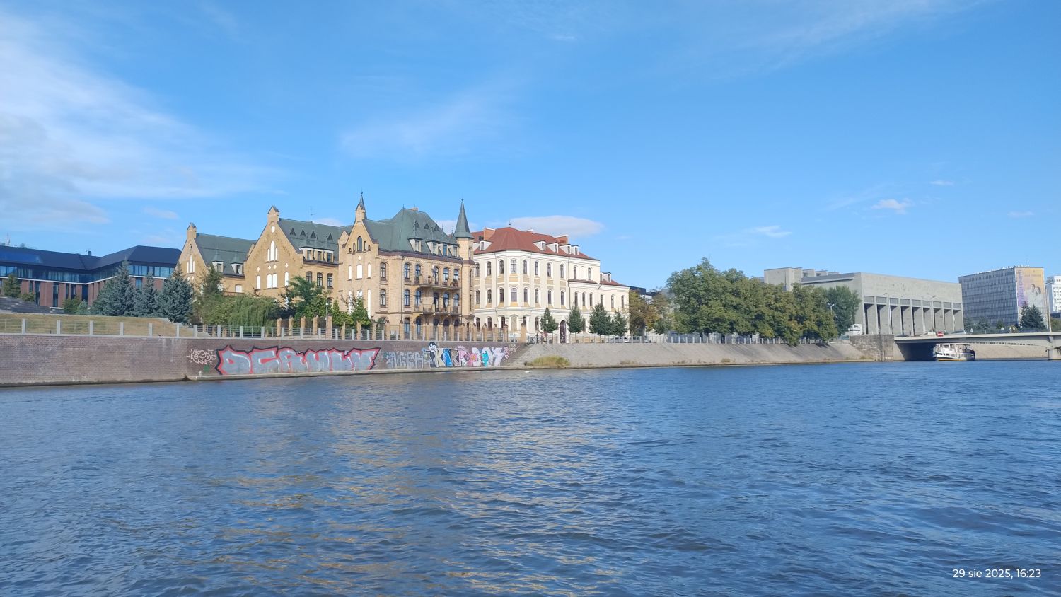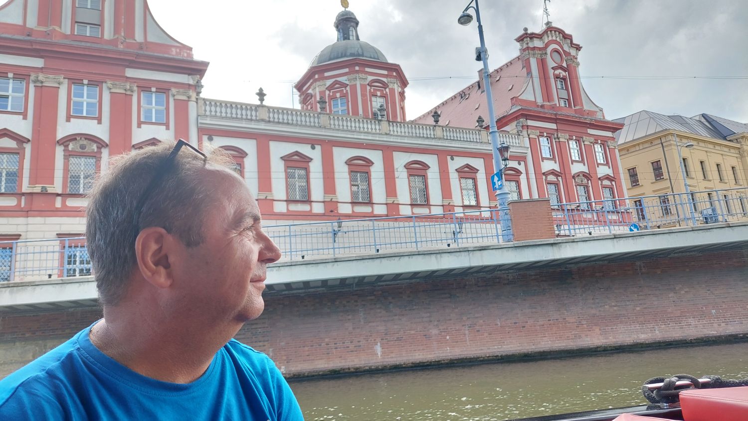 Wrocław jest nazywany miastem 100 mostów i sporo ich tu jest. Wybraliśmy się na rejs po Odrze. Przechodząc przez Ostrów Tumski i przez Most Tumski zwany też miłości, bo na nim młodzi małżonkowie zakładali kłódki i wrzucali klucz do rzeki z nadzieją, że ich związek przetrwa do starości (my nigdzie nie zakładaliśmy kłódki, a już obchodziliśmy 40 rocznicę ślubu), a kłódki miasto zdjęło i przetopiło na metal a było ich 42 tyś. teraz kłódki zakładają na nabrzeżu, na Wyspie Piasek wynajęliśmy katamaran elektryczny. Nim to opłynęliśmy wyspy Piasek, Daliową, Tamkę, Słodową, Młyńską i pod Mostem Młyńskim (jest ich dwa) popłynęliśmy w stronę Mostu Grunwaldzkiego za którym zawróciliśmy i powróciliśmy do Wyspy Piasek gdzie rozpoczynaliśmy rejs. Całość trwało około 50 min.