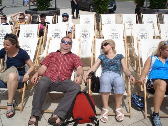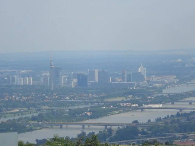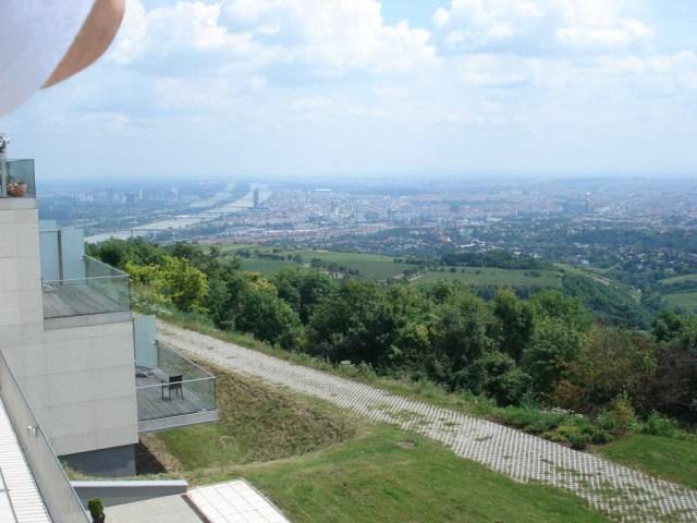 A tu panorama na Wiedeń z wzgórza Kahlenberg (po polsku Łysa Góra) 500 m n.p.m z kościołem Św. Józefa i leżakami na których odpoczywamy (nie wiem po czym)