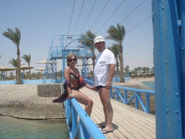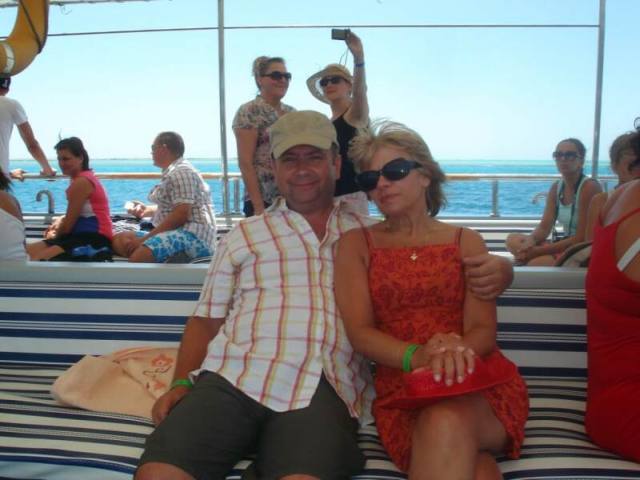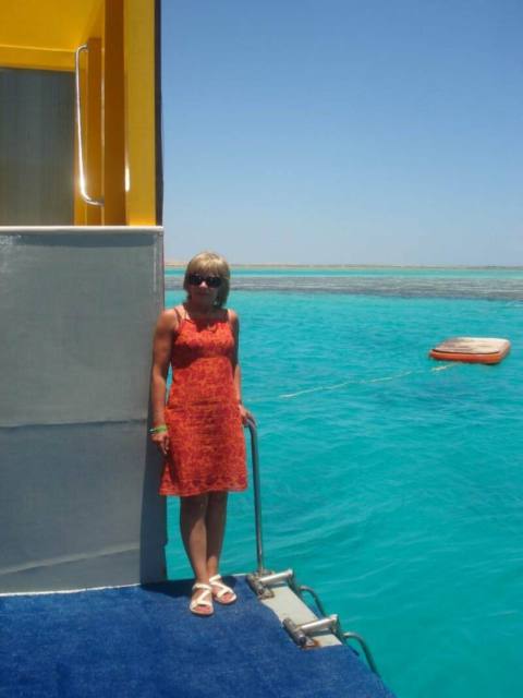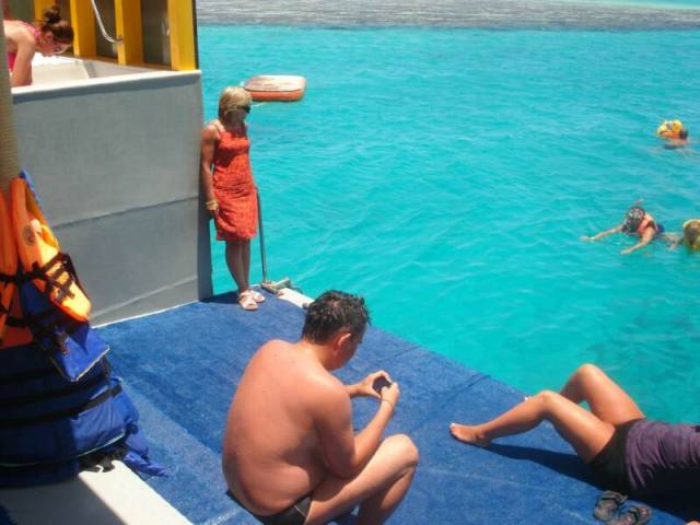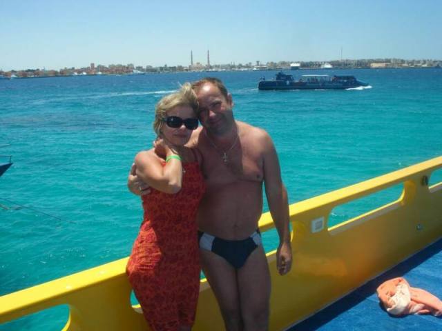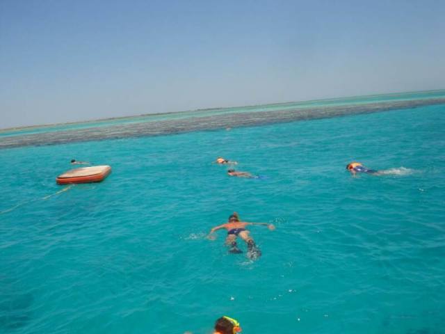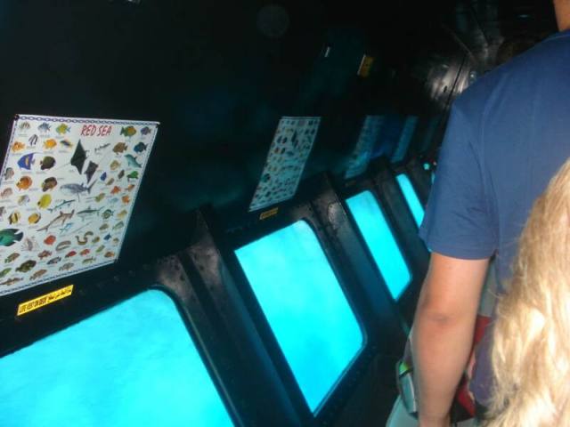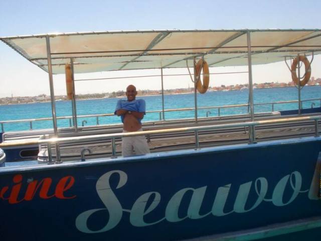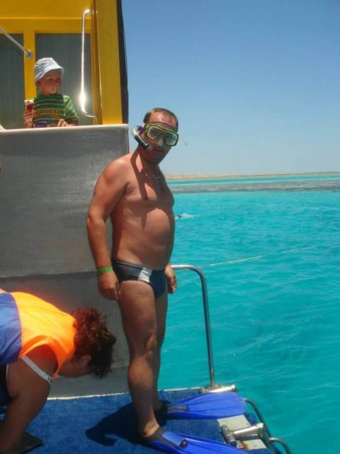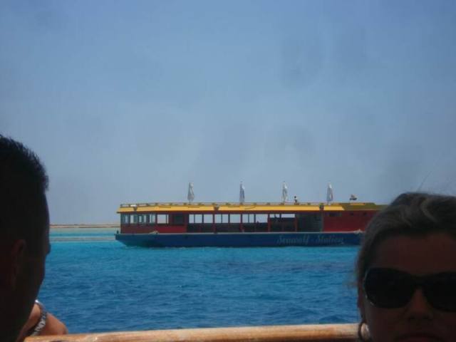 Z naszymi znajomymi poznanymi tu zafundowaliśmy sobie wycieczkę na tz. RYBKI PRZEZ SZYBKI. Zawieźli nas do Hurghady minibusem a tam na statek który pod pokładem miał szyby przez które oglądaliśmy rafę i ryby. Był też postój i razem z Wojtkiem poszliśmy pływać, ja pierwszy raz w płetwach byłem.