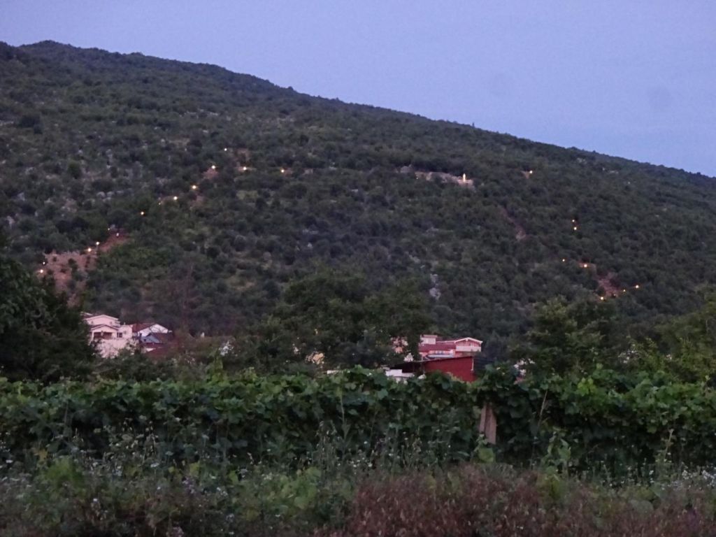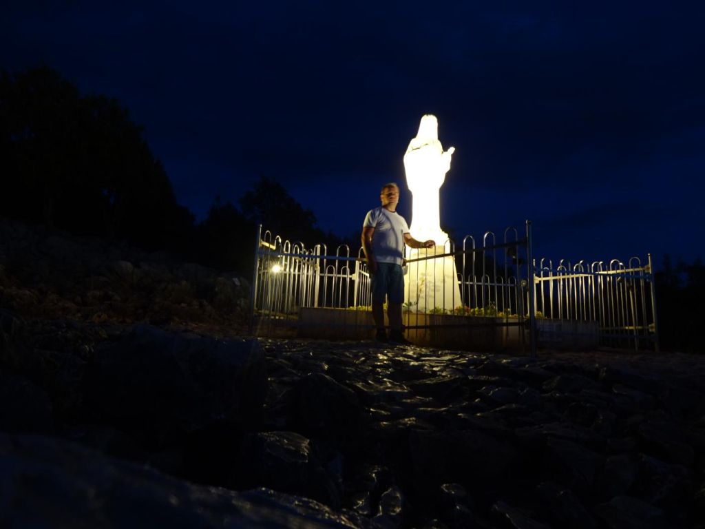 Góra Objawień - na Górę Objawień idzie się przez pola a potem po skałach tak do połowy góry. Na zdjęciu nocnym bardzo ładnie to widać. Koło figury wszyscy zachowują się bardzo cicho i często przekazują sobie znak pokoju (głównym objawieniem MB była modlitwa o pokój).