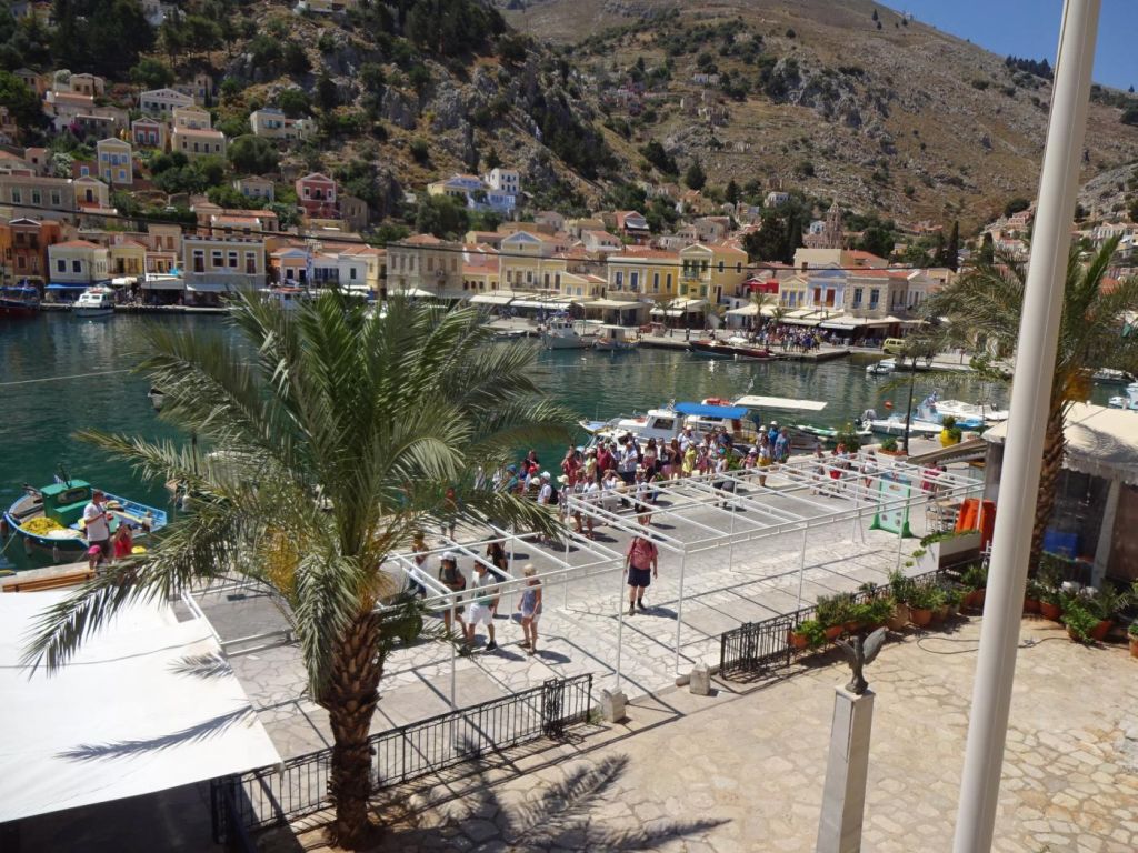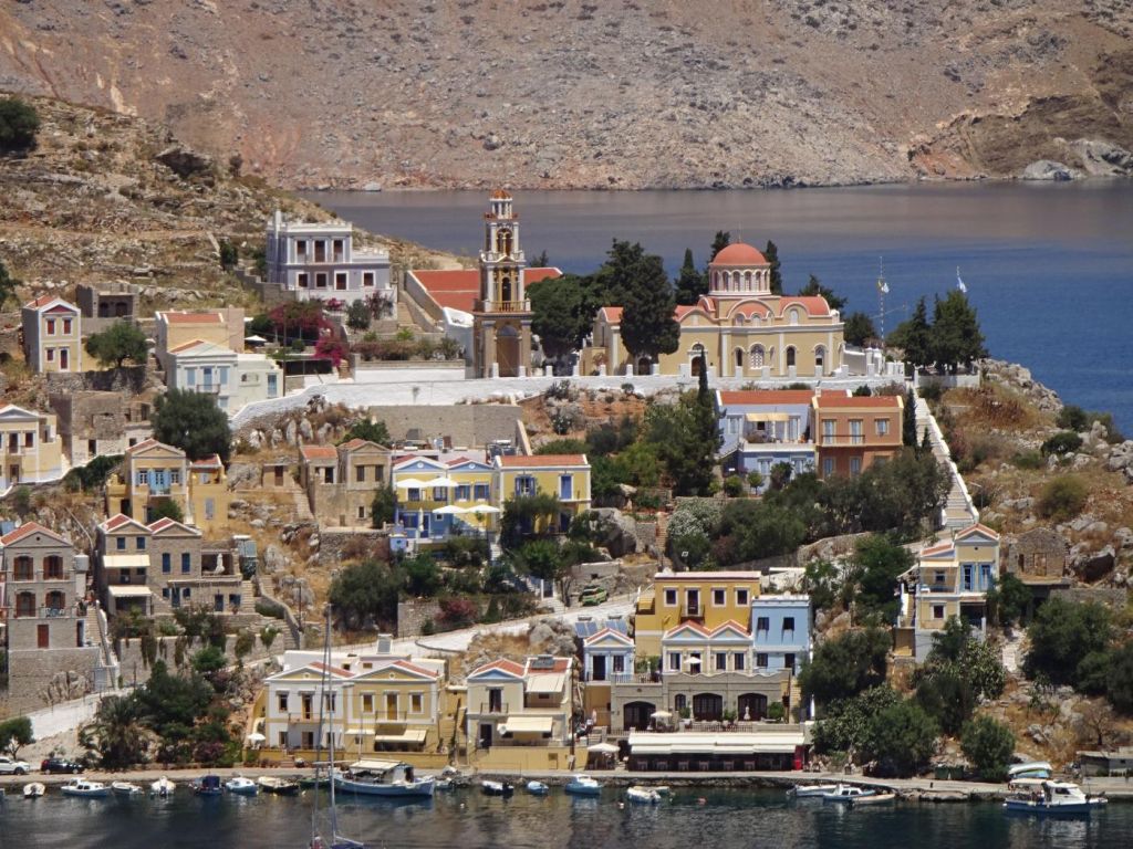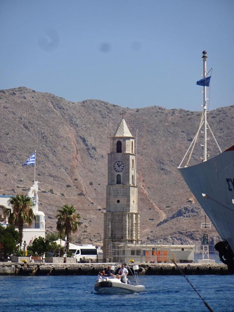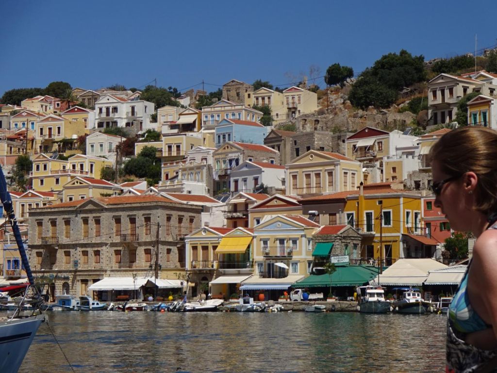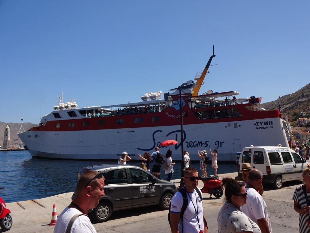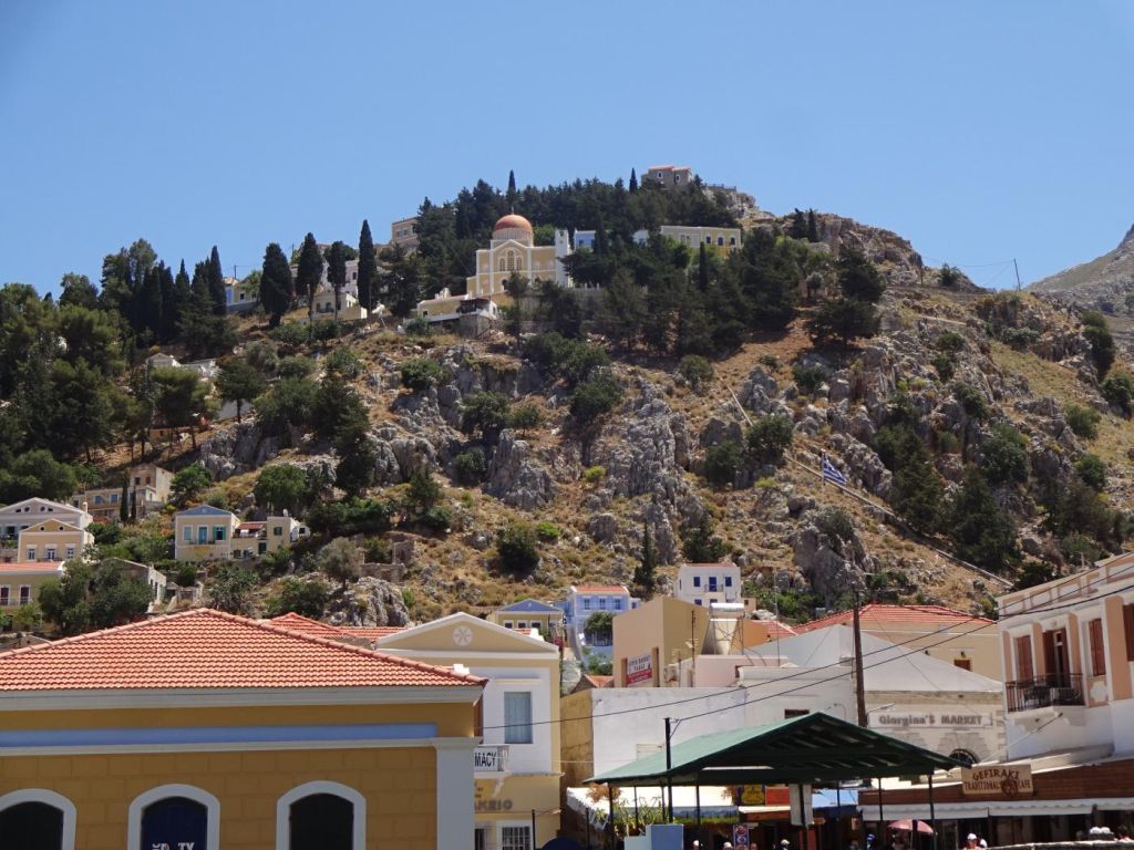 Symi - wyspa na którą płynęliśmy promem. Bardzo urokliwe miejsce, były tu nagrywane niektóre filmy. Wyspa która nie posiada żadnych źródeł wody słodkiej, woda jest dowożona, uzdatniana z wody morskiej lub pozyskiwana z opadów. Zjedliśmy tu obiad w restauracji popijając greckim piwem. W drodze powrotnej wpłynęliśmy do zatoki w której jest klasztor z cerkwią.