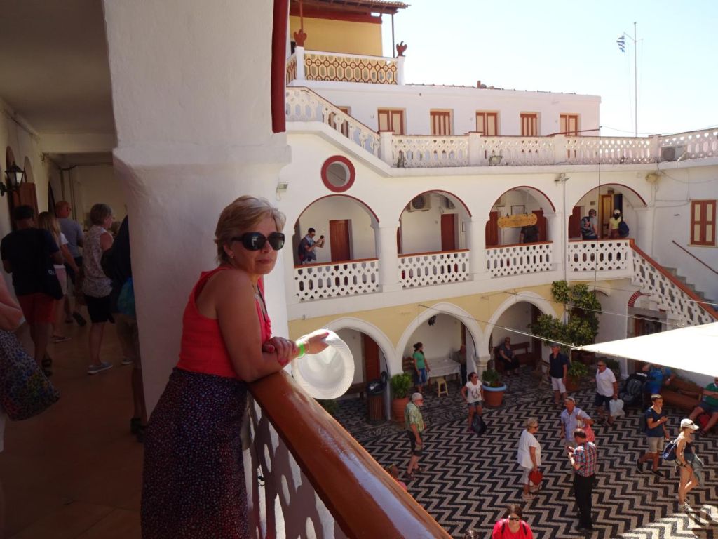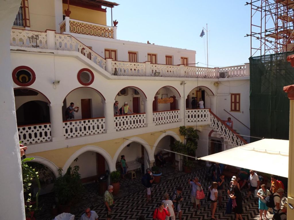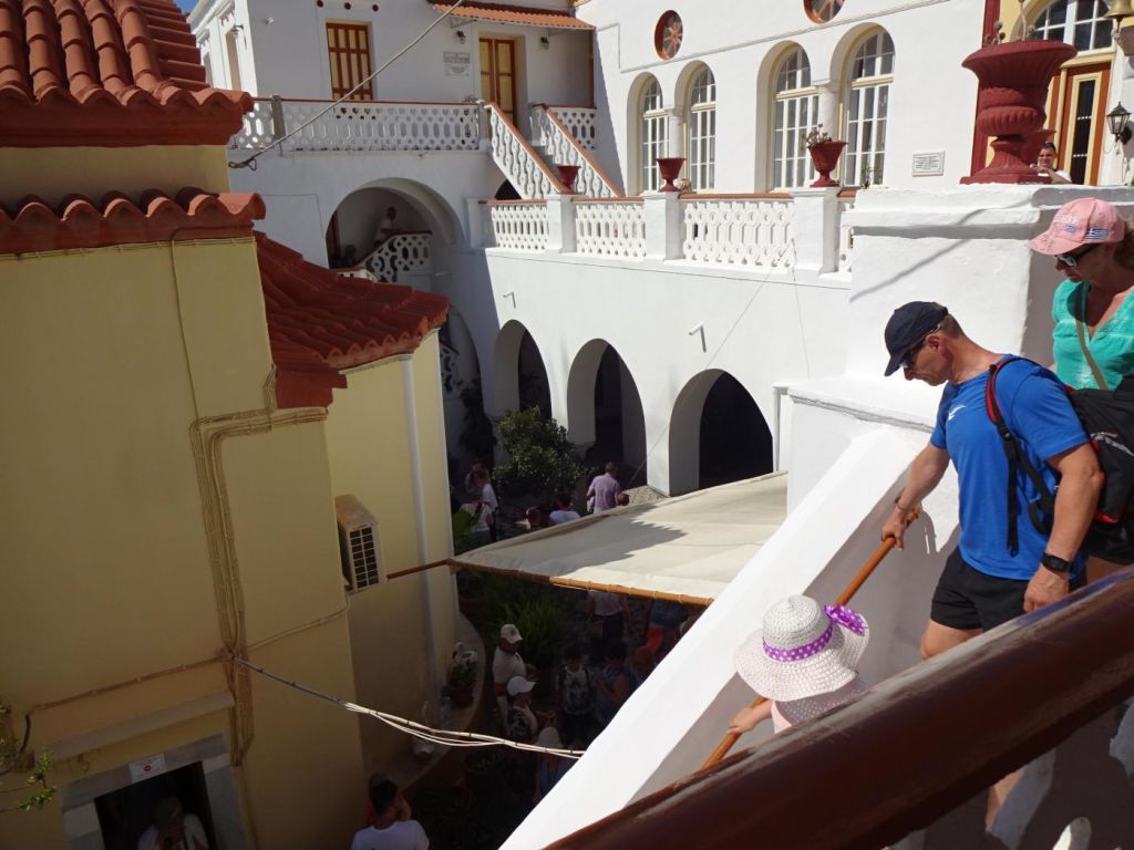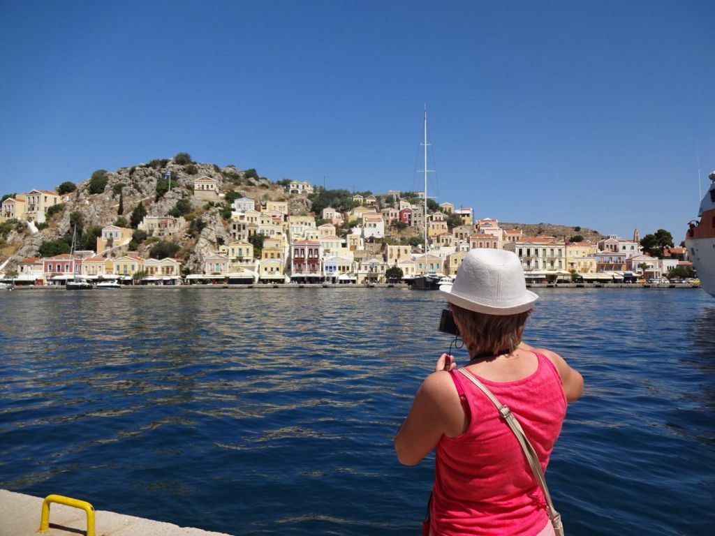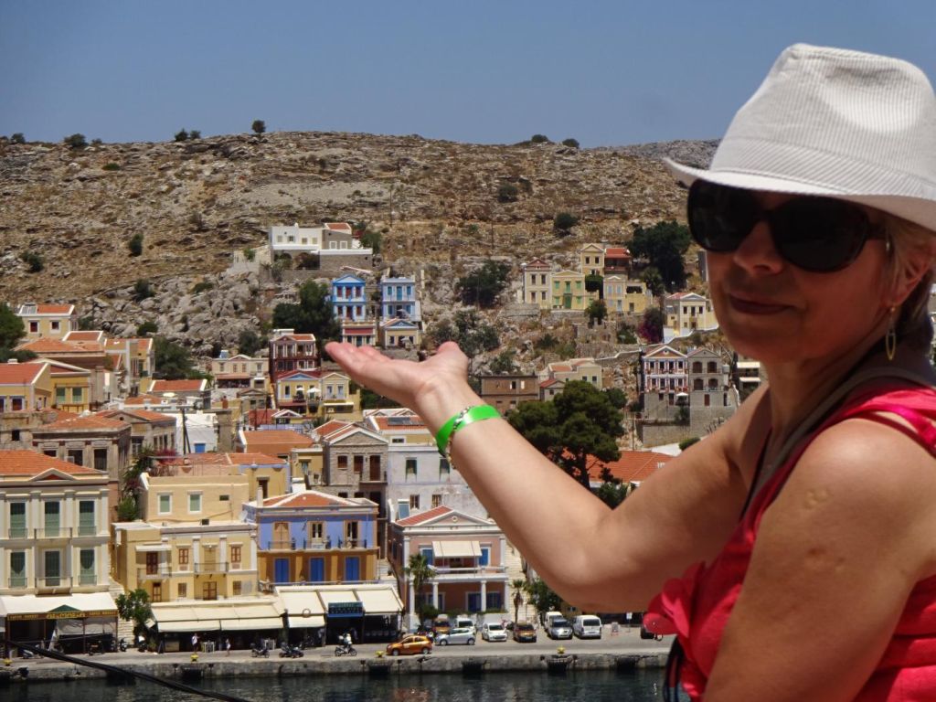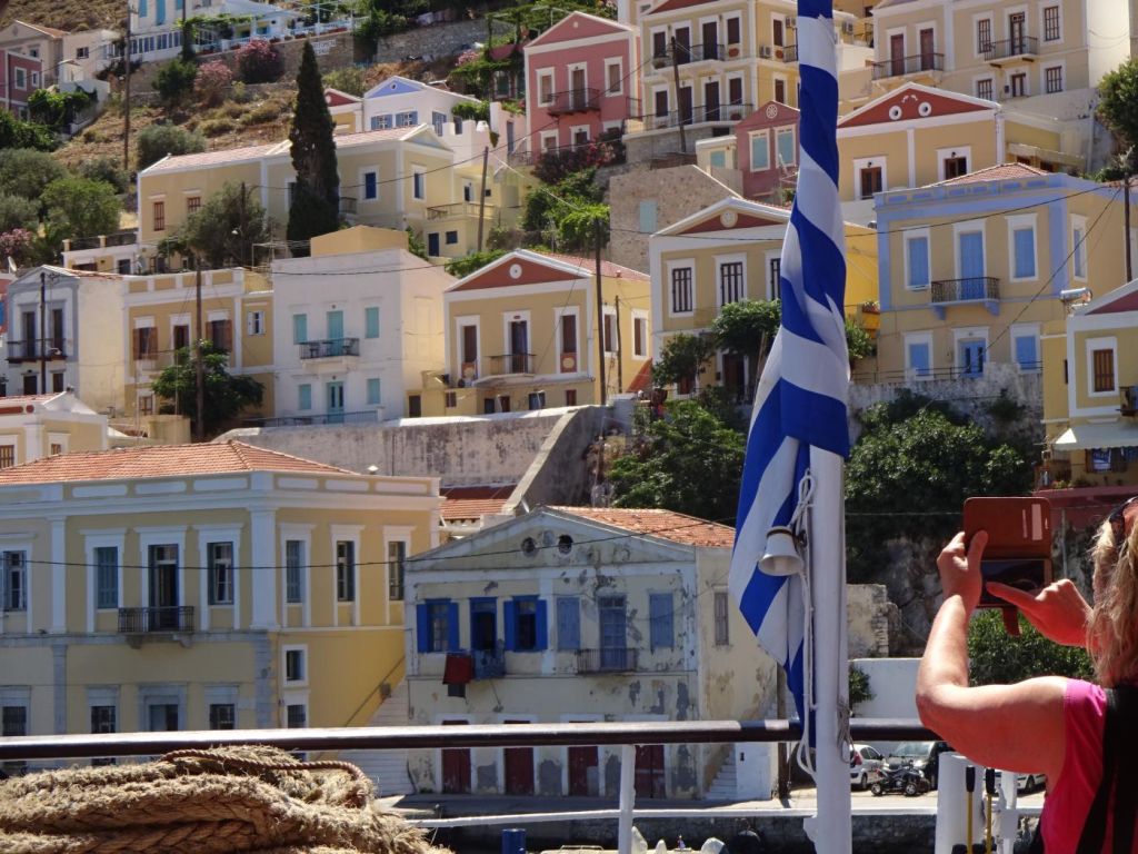 Symi - wyspa na którą płynęliśmy promem. Bardzo urokliwe miejsce, były tu nagrywane niektóre filmy. Wyspa która nie posiada żadnych źródeł wody słodkiej, woda jest dowożona, uzdatniana z wody morskiej lub pozyskiwana z opadów. Zjedliśmy tu obiad w restauracji popijając greckim piwem. W drodze powrotnej wpłynęliśmy do zatoki w której jest klasztor z cerkwią.