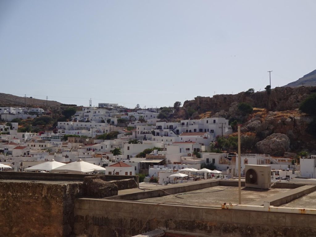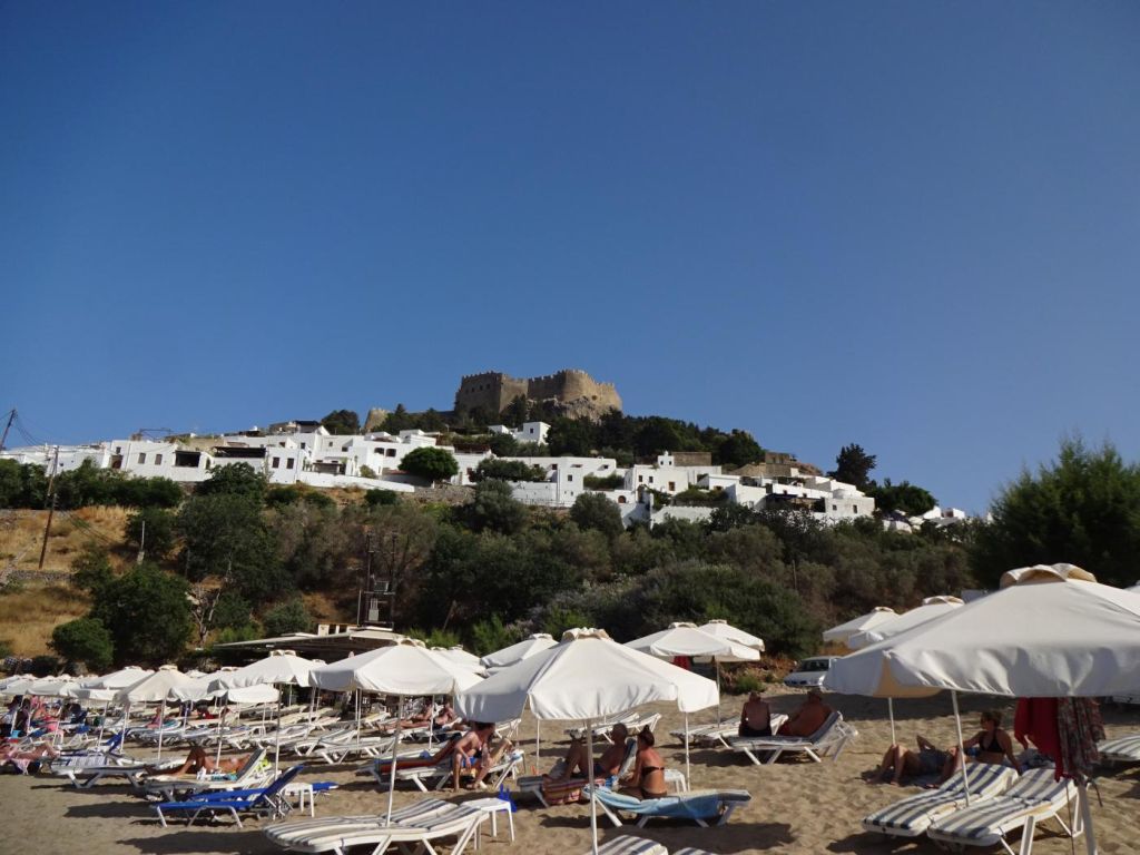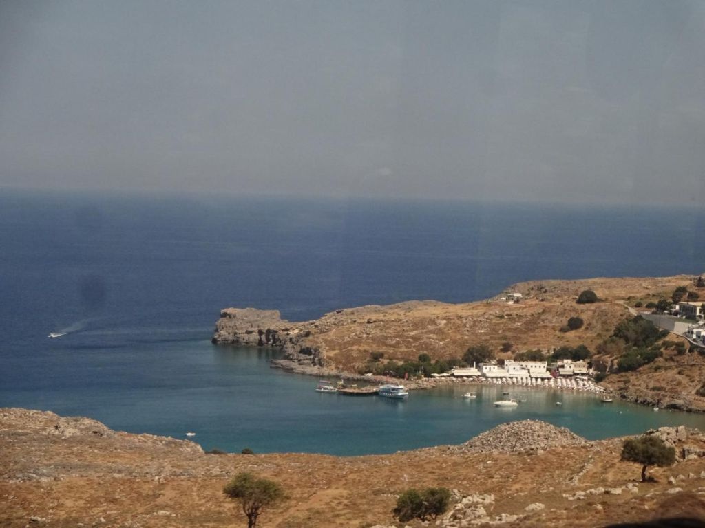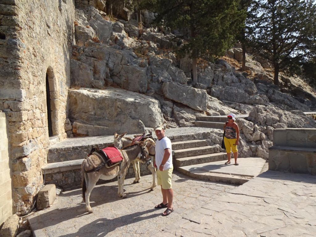 Lindos - pojechaliśmy autobusem za 4 EURO. Mała miejscowość obok góry na której jest akropol (ruiny). Lindos ma bardzo ładną plaże z piaseczkiem w takiej zatoczce. Na górę można wjechać na osiołku za 5 EURO, ale żal nam było tych zwierząt i szliśmy na nogach mijając wiele straganów i sklepików z wszystkim co możliwe, od souvenir do ubiorów. Samo wejście do środka akropolu kosztuje 12 EURO od osoby.